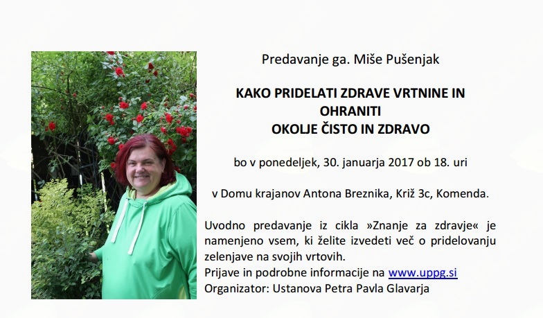 Uvodno predavanje iz cikla »Znanje za zdravje« je namenjeno vsem, ki želite izvedeti več o pridelovanju zelenjave na svojih vrtovih. Predavanje »Kako pridelati zdrave vrtnine in ohraniti okolje čisto in zdravo« bo imelo zaradi vrednosti svojo ceno 10.00 EUR/udeleženca – tako zaradi pokrivanja stroška izvajalcu, kot tudi podpore k nadaljnjim raznovrstnim aktivnostim naše Ustanove.