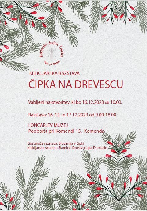 Članice in član klekljarskega društva Čebelica vas vabimo na našo tradicionalno letno razstavo. Letos se vam predstavljamo, času ustrezno, z razstavo "Čipka na drevescu".