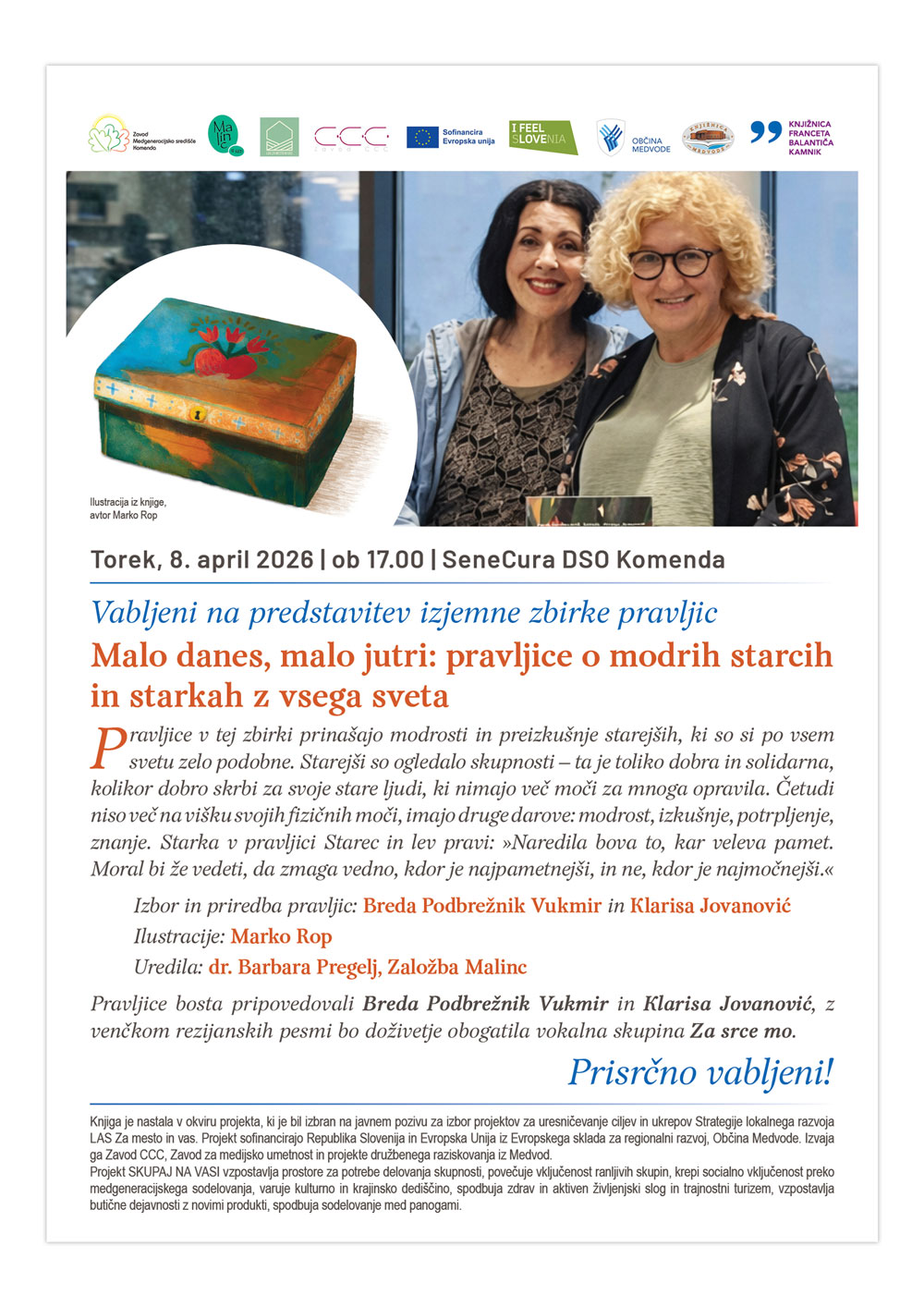 Pravljice bosta pripovedovali Breda Podbrežnik Vukmir in Klarisa Jovanović, z venčkom rezijanskih pesmi bo doživetje obogatila vokalna skupina Za srce mo.