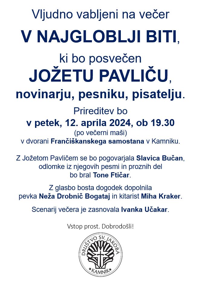 Društvo sv. Jakob Kamnik in Frančiškovi bratje vas ob dnevu poezije in dnevu knjige vabijo na literarni večer Jožefa Pavliča. Avtor bo na njem v pogovoru s sodelavko Radia Kranj Slavico Bučan, voditeljico številnih kulturnih dogodkov in skrbno pripravljavko radijskih oddaj, predstavil devet zelo raznovrstnih knjig, ki jih je napisal od upokojitve oktobra 2018.