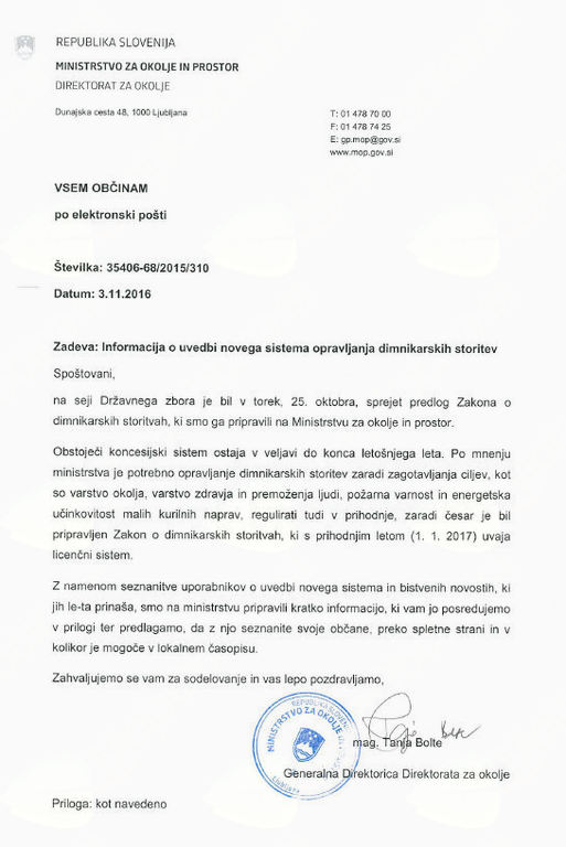 Ministrstvo za okolje in prostor vse uporabnike dimnikarskih storitev obvešča o spremembah na področju opravljanja dimnikarskih storitev.
