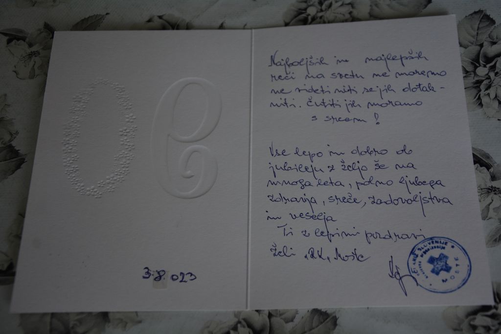 Jubilantka na življenje gleda zelo preudarno: »Nič več si ne želim preveč!« Na to jo opominjajo tudi težave z nogami. Je pa Bogu, možu Antonu, sinovoma in ljudem hvaležna za vse, kar so ji dali v življenju. Podarjala pa se jim je tudi sama, ko je imela poleg službe pri zdravniku Celestini »ordinacijo« kar doma. Res dekle, žena, mati, medicinska sestra in sedaj babica z zlatim srcem in zlatimi rokami. Veliko ji je hvaležnih za to, kar je naredila zanje.