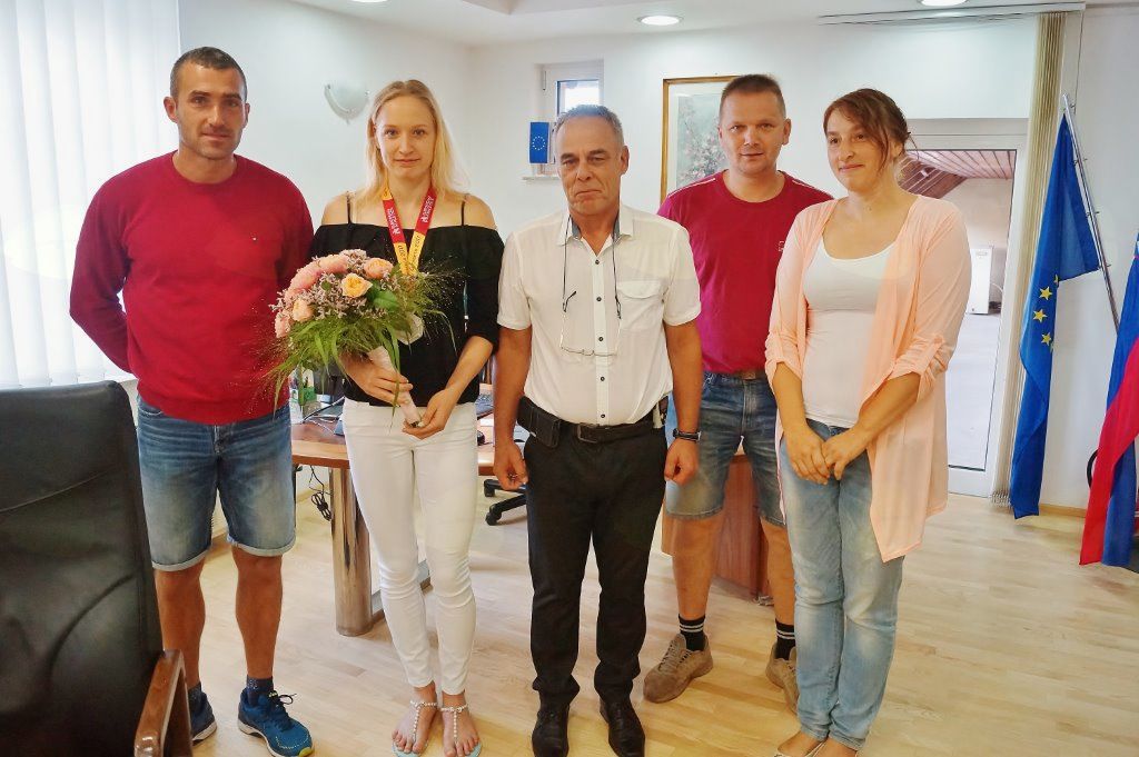 Komendčanko Agato Zupin z Brega 20, ki je letos na slavnostni seji Občinskega sveta ob občinskem prazniku občine Komenda 15. maja prejela priznanje za najboljšo športnico v mladinski konkurenci, je danes, 28.¸julija, v spremstvu trenerja in staršev sprejel župan Stanislav Poglajen.