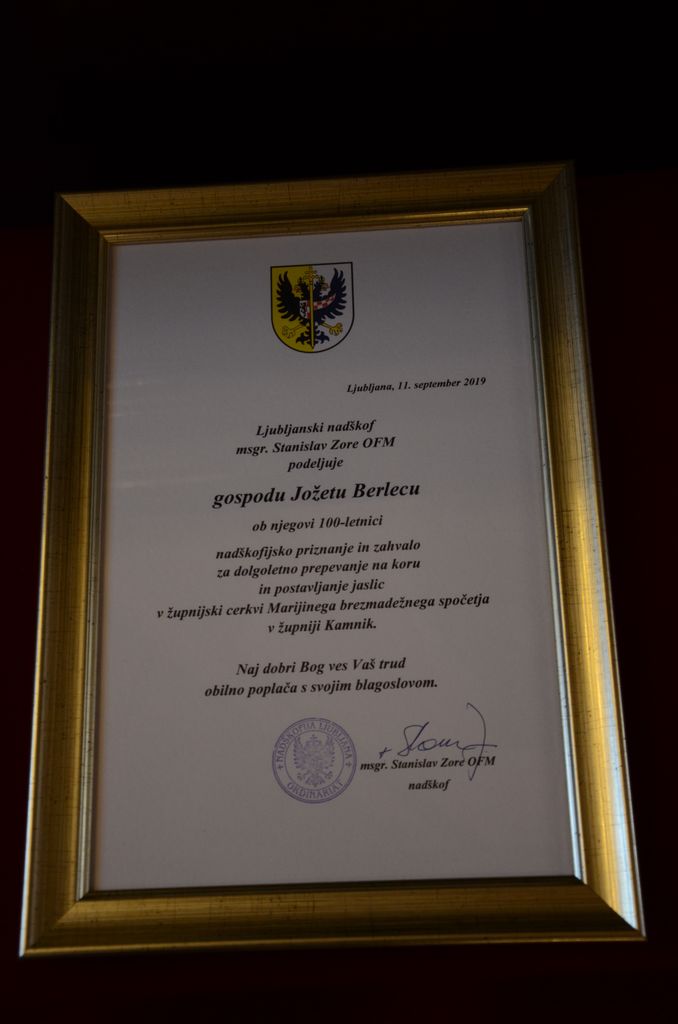 Priznanje mu je izročil kamniški župnik Luka Demšar,  ki ima velik posluh za ljudi, zna delati z njimi, spoštovati njihovo naravnanost k dobremu in k žrtvovanju, s čimer je povezano življenje in delovanje gasilcev. Prostovoljno pomočjo ljudem v stiski, pa tudi s priprošnjo k zavetniku sv. Florijanu, kadar odpovedo človeške moči, znanje in izkušnje. Z vsem tem se je v svojem dolgem življenju srečeval stoletnik Jože Berlec. In prinašal mir, koristen nasvet in modro presojo. Zato mu v teh dneh v resnici in v duhu stiska roko na tisoče Kamničanov, prebivalcev Občine Kamnik in Slovencev, ki ga poznajo, spoštujejo, se veselijo z njim vred. Z željo, da bi stotim letom dodal še katero. Njegovo delo pa bo tako ostalo neizbrisno zapisano v kamniško in slovensko cerkveno in gasilsko zgodovino.