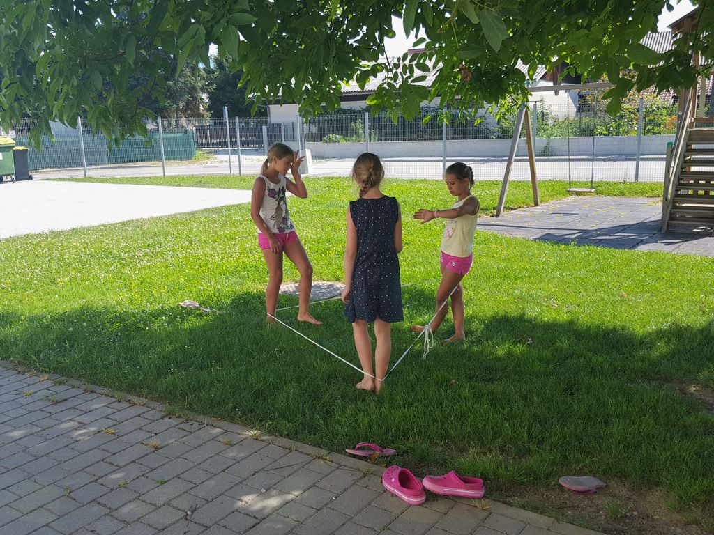 Jutro se je začelo z bogatim zajtrkom, ki je bil vsak dan drugačen, nato so sledile razne dejavnosti, ki so bile prilagojene vremenskim razmeram, ki so nam bile v tokratnem tednu lepo naklonjene. Cela ekipa otrok se je podala na sprehod do različnih igrišč, katera so nam ponujena v občini. Vsak dan pa so otroci pod budnim očesom animatork tudi skuhali kosilo in se nato sproščeno lotili ustvarjanja in zabavi. Tudi posladki niso manjkali.