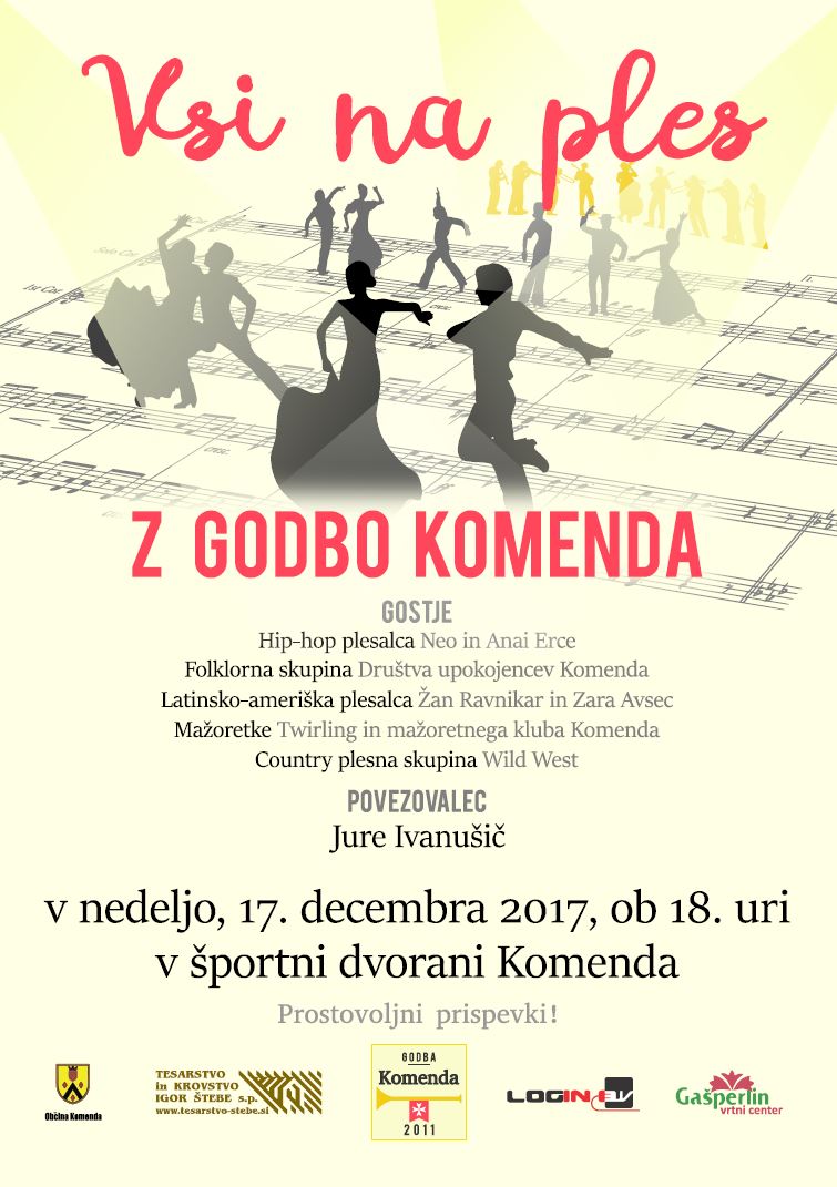 Godba Komenda pripravlja že tretji zaporedni božično-novoletni koncert, tokrat z naslovom Vsi na ples, ki bo v nedeljo 17. decembra ob 18h v Športni dvorani Komenda. Če imate radi godbo in ples, na tem koncertu ne smete manjkati. Z nami bosta hip-hop plesalca Neo in Anai Erce, folklorna skupina Društva upokojencev Komenda, latinsko-ameriška plesalca Zara Avsec in Žan Ravnikar, mažoretke mažoternega kluba Komenda in country plesna skupina Wild West.