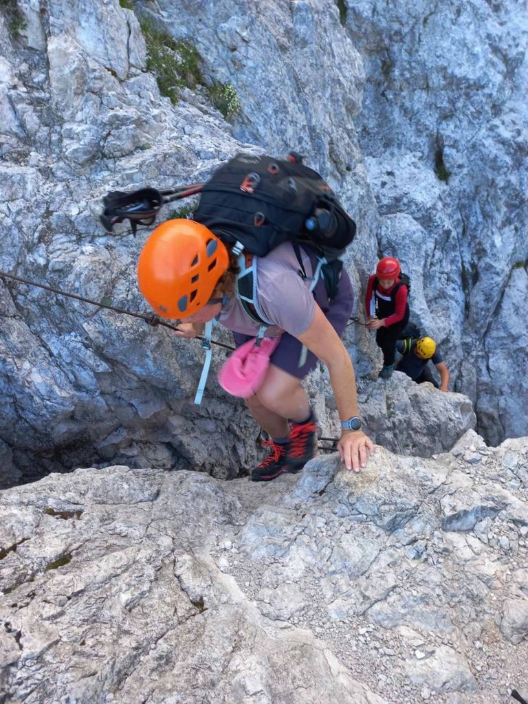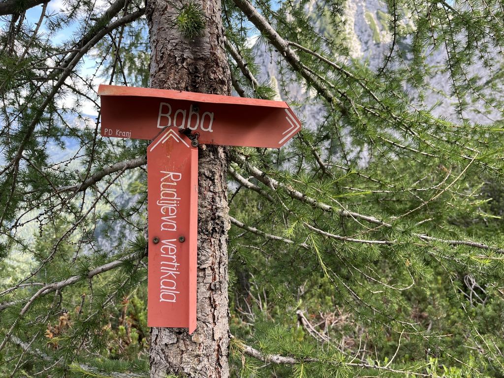 Pot nadaljevali do Velike Babe in sicer po plezalni poti, Rudijeva vertikala. Olala! Tukaj pa se začne »veselica«. Čelade, varovalni pasovi in vrvi za privez pripravljeni. Naši vodniki in markacist so poskrbeli za vrhunski plezalni podvig, Leon nas je pa zabaval s pregovori . Na vrhu Velike Babe imeli prekrasen razgled na vrhove okoli Velike Babe: Skuta, Dolgi hrbet, Kočna, Grintovec, Ledinski vrh, Storžič, Košutnikov greben, …