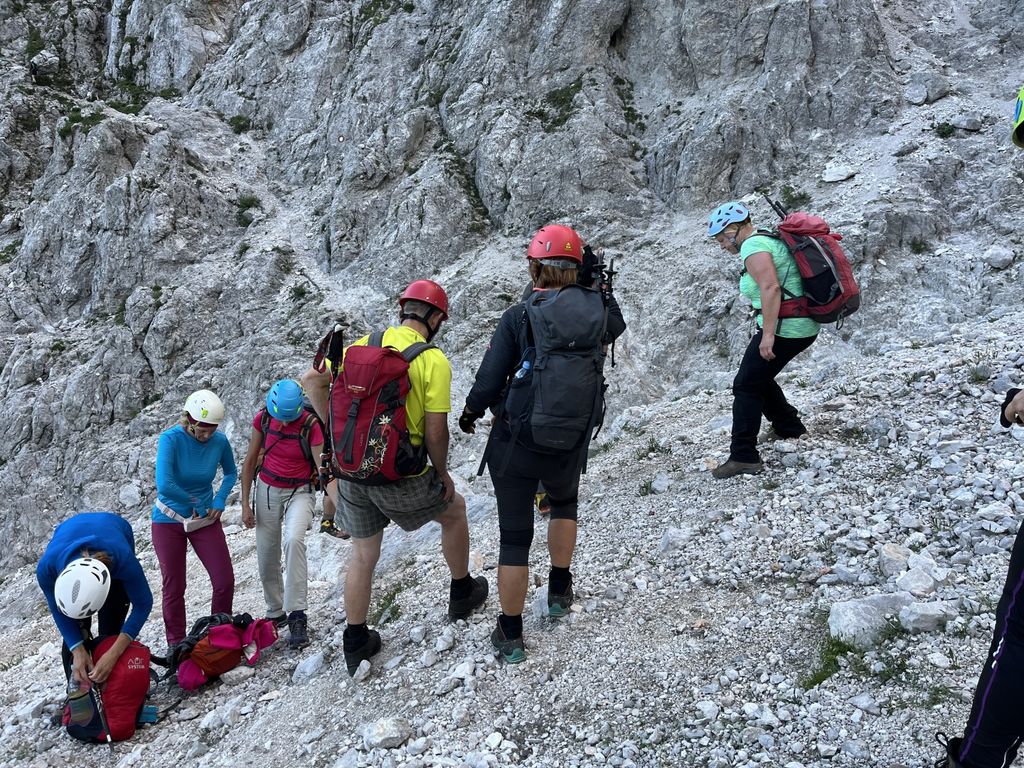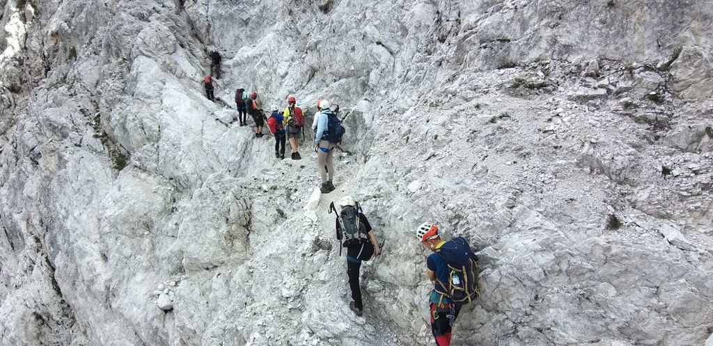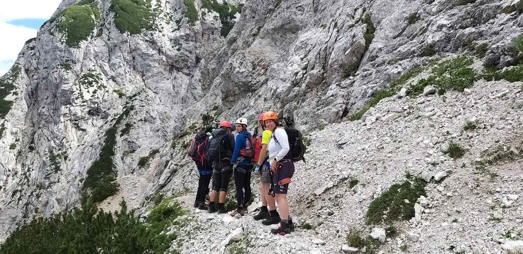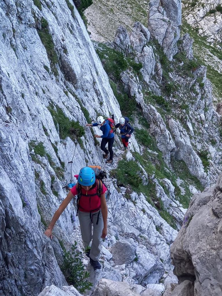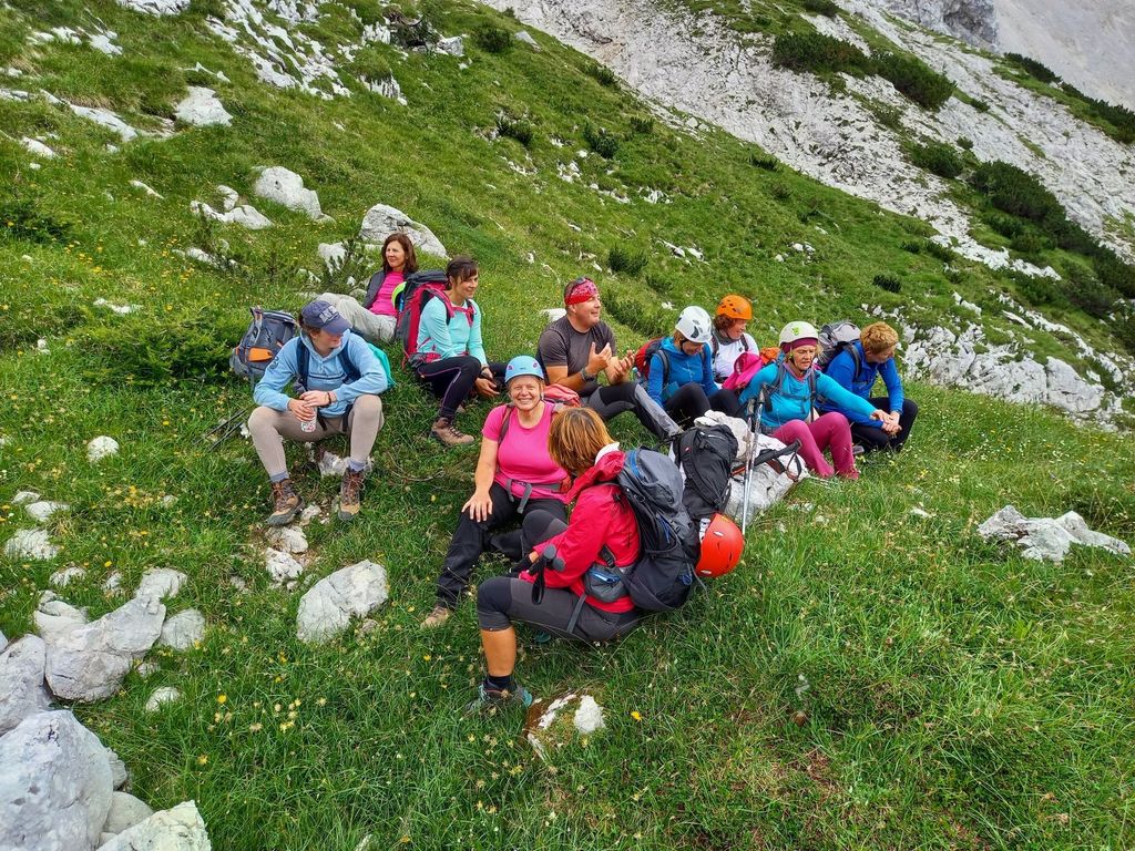 Ture se je udeležilo 9 žensk, 4 moški in 1 otrok, Leon. Ekipa se je hitro vživela (pri toliko ženskah ne gre drugače) in tudi hitro segrela. S seboj je vsak udeleženec moral imeti čelado in varovalni komplet. Že zelo hitro smo se prvič ustavili, da smo se pripravili (čelada) na prve jeklenice na Slovenski poti. Na tej poti smo se »spoznavali« s skalami, jeklenicami in tudi vrtoglavico(vsaj ena).