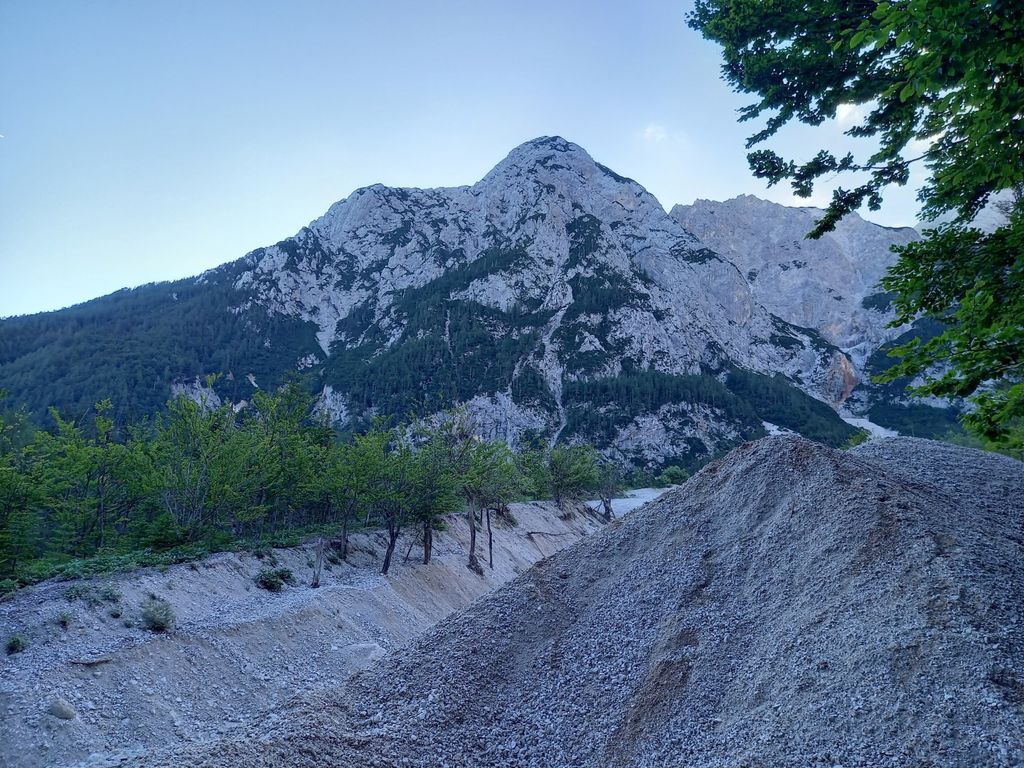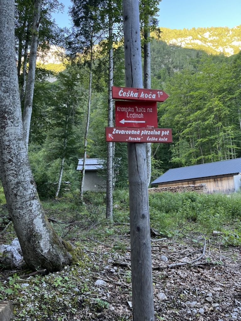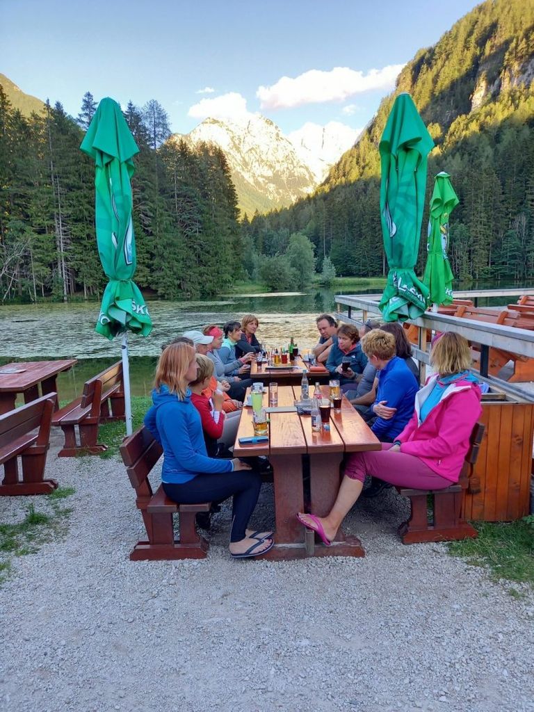Prišli do prvega postanka, Kranjska koča na Ledinah, kjer so redki jutranji gostje uživali v razgledih. Ujeli smo tudi PD Kranj, ki so imeli začetek delovne akcije, ki smo jo pri sestopu že v živo videli: drevesna lesena terasa nad veliko teraso -top!