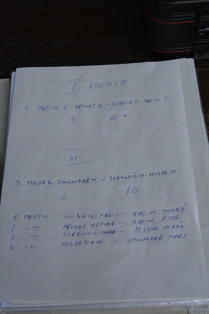 Prva sta bila tokrat Fani Sodnik in Tomaž Hacin, vodja sekcije za balinanje pri DU Komenda pa tudi sodnik in trener. V napetem boju sta s tesnim izidom 5 : 4 premagala drugouvrščena Emo Hacin in Alfonza Hrovata. Tretje mesto sta zasedla Marko Jurkovič in Miro Misja, ki sta z rezultatom 10 : 6 premagala že omenjena Dani Misja in Mari Smolnikar.