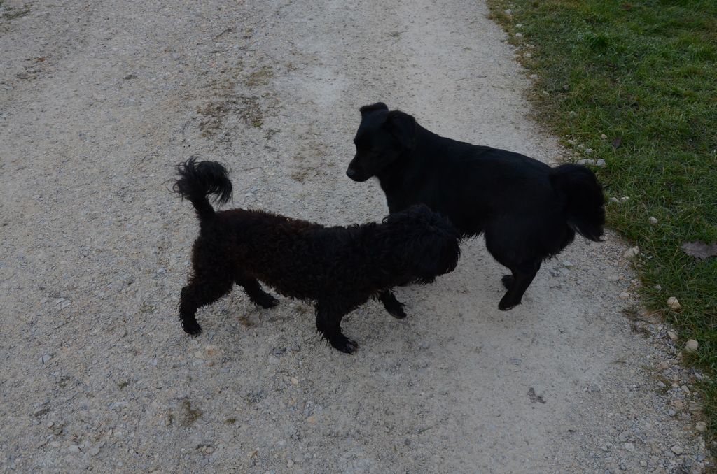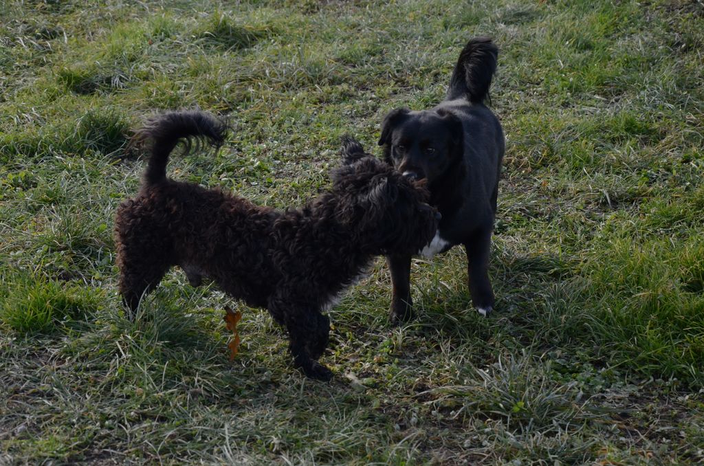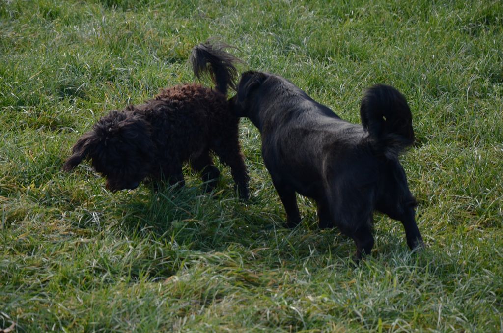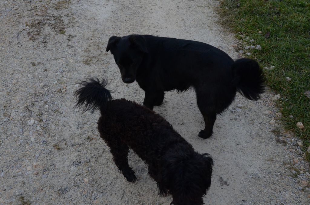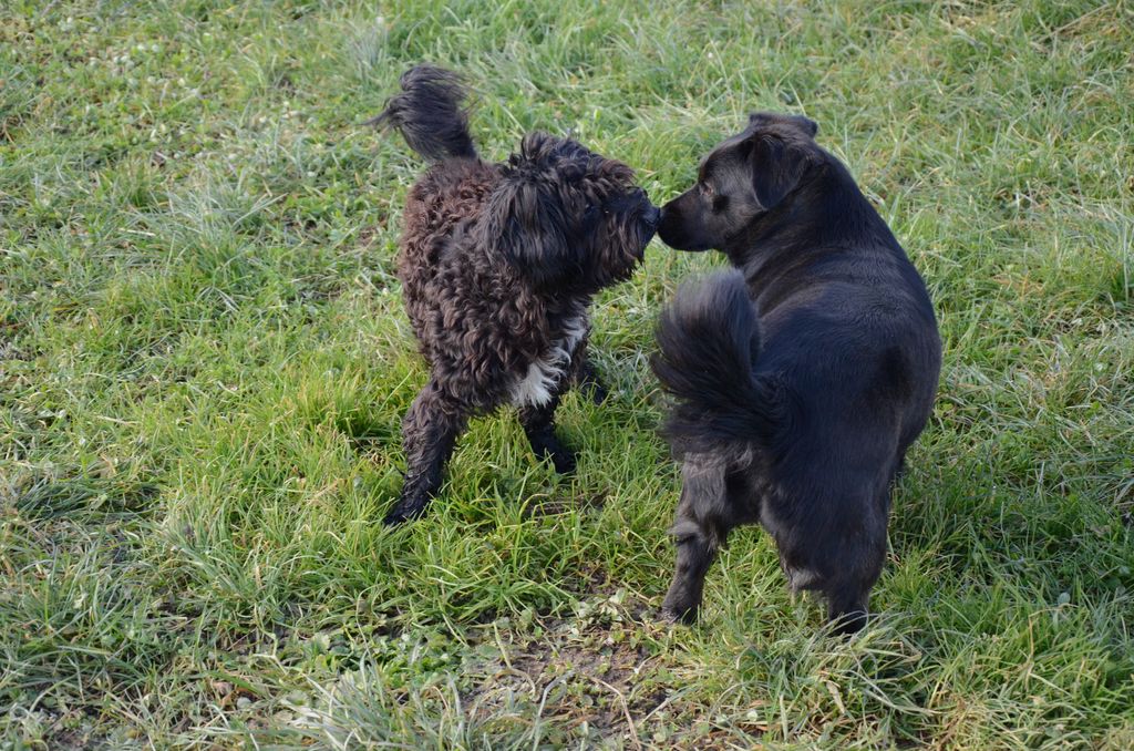 Kimi, križanec med pudljem in maltežanom, pri srečanju s sila prijazno psičko Taro.