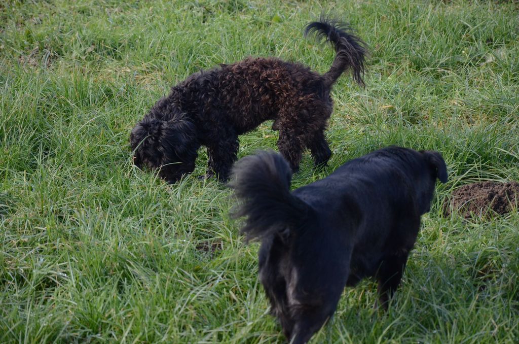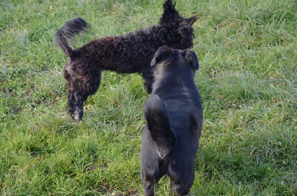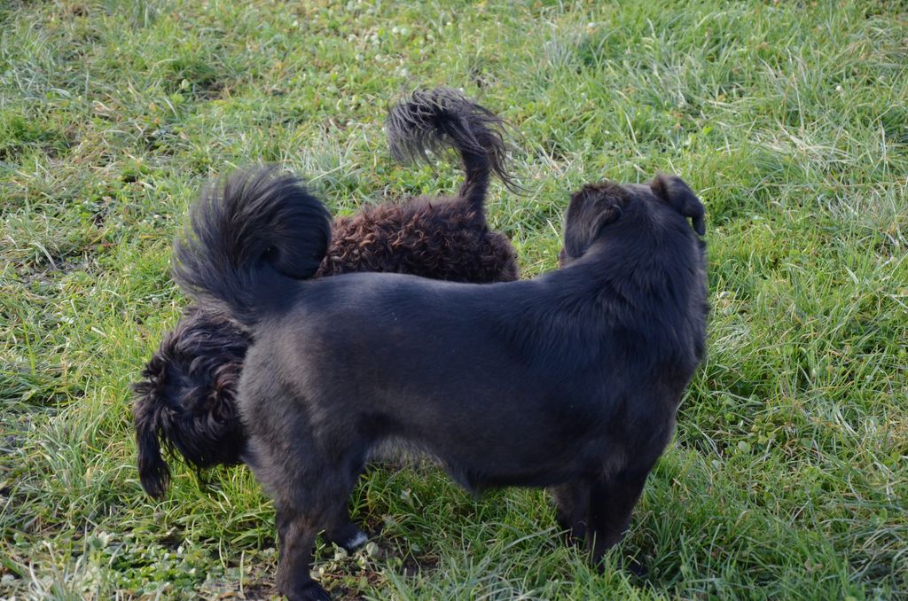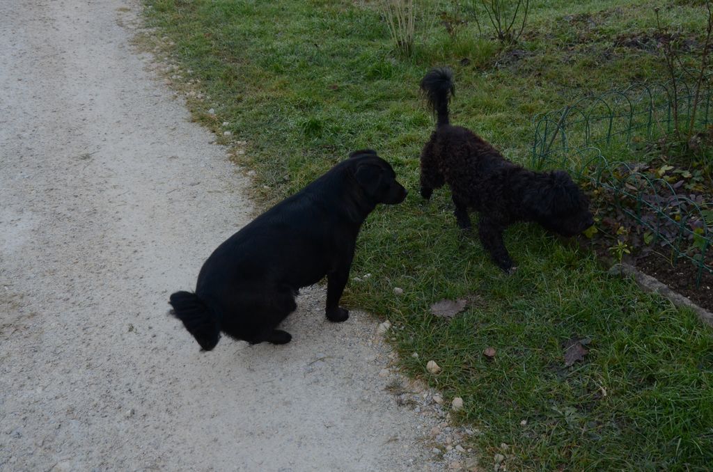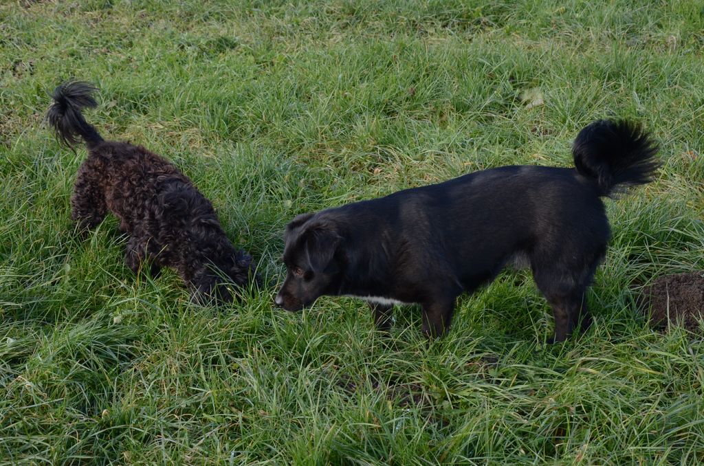 Kimi, križanec med pudljem in maltežanom, pri srečanju s sila prijazno psičko Taro.