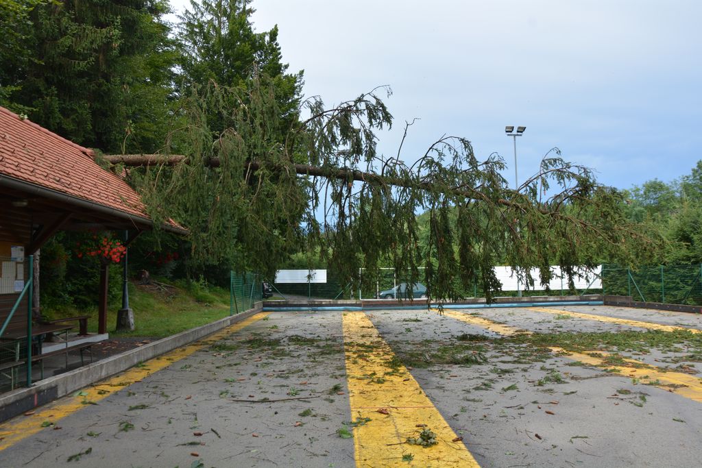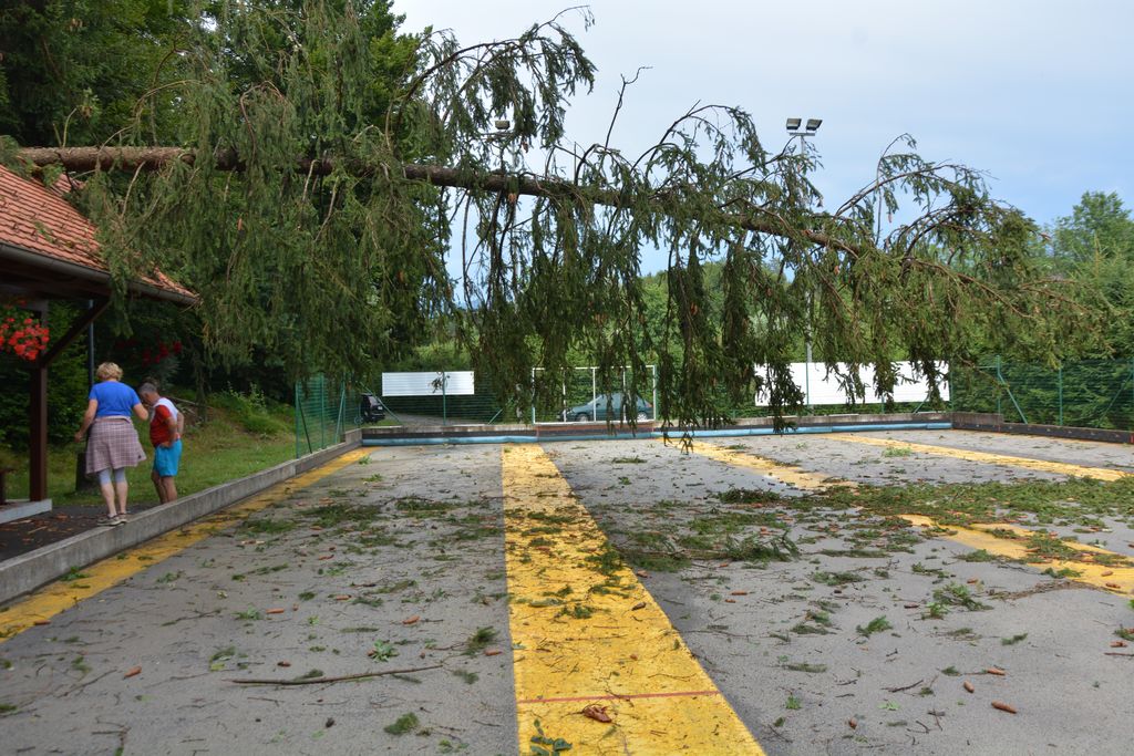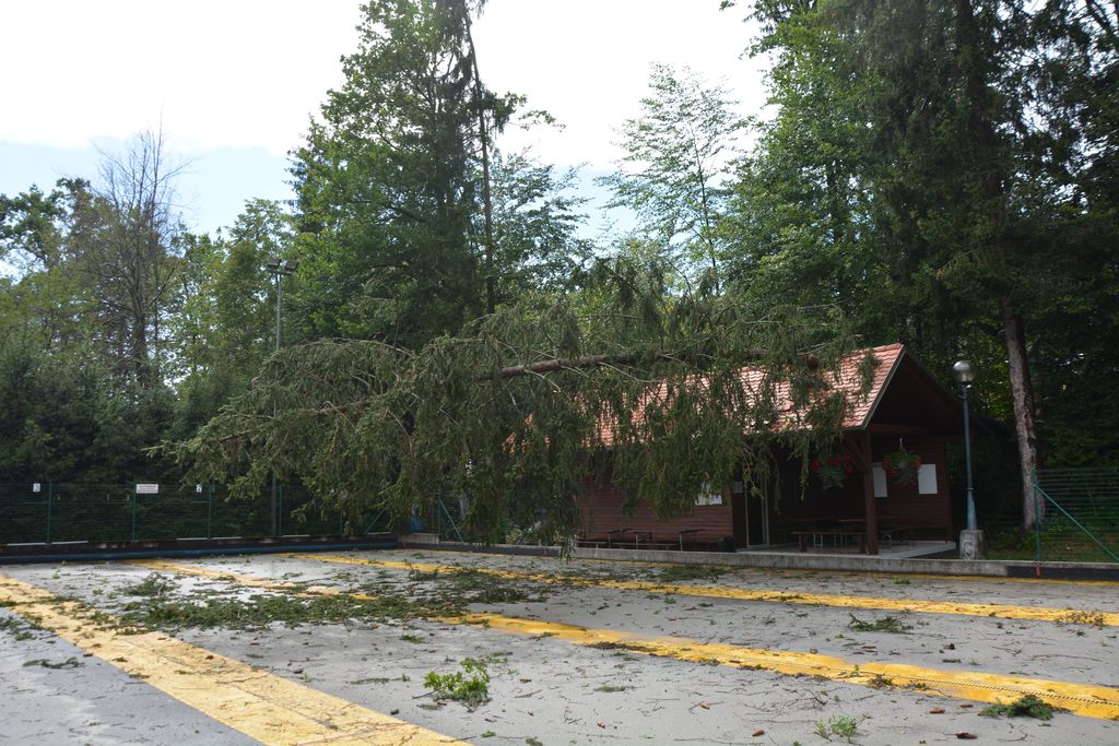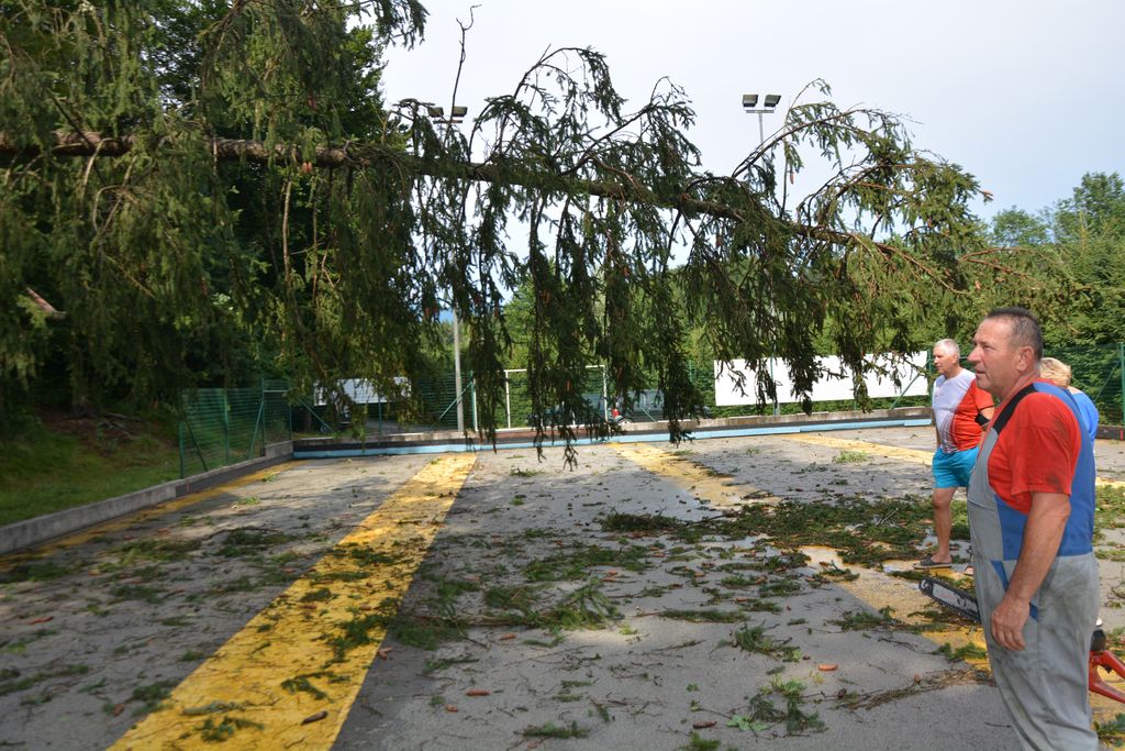 Nato sem šel navijat za našega vrhunskega kolesarja Tadeja Pogačarja, da bi tokrat po včerajšnjem kronometru, na katerem je bil drugi, premagal najhujšega tekmeca za končno zmago Danca Jonasa Vingegaarda. Ne dolgo, saj me je poklical sodnik na tekmah Balinarske sekcije pri DU Komenda Tomaž Hacin, naj pridem fotografirat smreko, ki jo je močan veter podrl na brunarico pri Balinišču Komenda v bližini Planinskega doma Komenda. To sem naredil nemudoma, da ne bi zamudil zadnjih kilometrov vožnje našega Tadeja. Spotoma se mi je ponujala zelo žalostna podoba naše občine, ko sem videl, kako veliko škodo je povzročil vihar. Voziti sem moral zelo pazljivo mimo vsega, kar je ležalo na cesti. Ko sem prišel do Balinišča Komenda, kar nisem mogel verjeti: velika smreka je visela daleč na igralne steze, zagozdena v samo streho brunarice. Še sreča, da je njen vrhnji tram zdržal njeno težo, je ni podrl ali prizadejal hujše škode, kot je že bila. Tam sta bila že predsednica Balinarske sekcije Ivanka Žulič in sodnik Tomaž Hacin. Kmalu je prišel še Marjan Potočnik, podsekretar za urejanje prostora na Občini Komenda, za njim pa še predsednik DU Komenda Saša Lenarčič. V bližini je Štefan Kociper obžagoval drugo smreko, ki jo je veter podrl blizu brunarice, prav tako odlomil vrh še ene smreke. Jeklena vrv in drugo, s čimer so se otroci spuščali, ko so bili starši gostje Planinskega doma, je bila na tleh. Pravo razdejanje na robu gozda ob Planinskem domu Komenda. Kakšno je po naši občini, sem videl, ko sem se po posnetih fotografijah na kraju Balinišča Komenda počasi peljal domov. Spotoma sem srečal komendske gasilce, ki so se peljali proti Balinišču Komenda. Že prej sem slišal, kako so na raznih koncih lastniki z motornimi žagami žagali in odstranjevali podrto drevje. Bilo je, kot da bi bil na sečnji v gozdu.