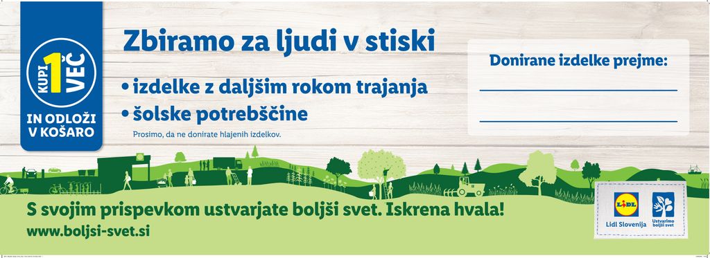 V Lidlovih trgovinah po Sloveniji so postavljene košare, s katerimi svoje kupce vabijo k nakupu hrane z daljšim rokom trajanja in šolskih potrebščin za določeno lokalno organizacijo, ki skrbi za dobrobit tistih, ki so se znašli v stiski. Košare so primerno označene.