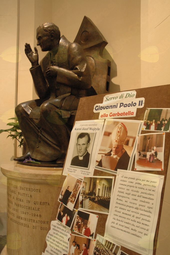 Romarji iz Slovenije, ki smo se v nedeljo, 1. maja, dopoldne v Rimu udeležili slovesne razglasitve papeža Janeza Pavla II. za blaženega, smo se dan prej popoldne zbrali pri maši v cerkvi sv. Frančiška Ksaverija v rimskem mestnem predelu Garbatella. Največja znamenitost in od razglasitve dalje tudi dodatna spodbuda za obisk številnih častilcev novega blaženega, je kip mladega Karla Wojtyle na desni strani cerkve, ko kot spovednik spovedancu deli odvezo (slovenski dar cerkvi). Na marmorju piše, da je novi blaženi tukaj pomagal v dušnem pastirstvu kot rimski študent. Kako zelo je bil Karel Wojtyla povezan s to cerkvijo in da jo je zato kot papež prvo obiskal med rimskimi župnijami, potrjujejo tudi razstavljene fotografije in besedilo ob njih na desni strani poleg kipa. Za Slovence je še prav posebnega pomena grb našega rojaka kardinala dr. Franca Rodeta in besede Stati inu obstati v barvnem oknu na pročelju cerkve.