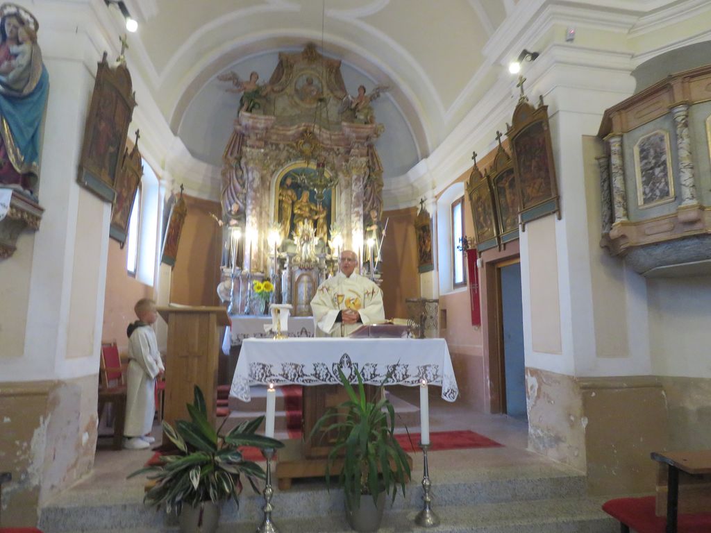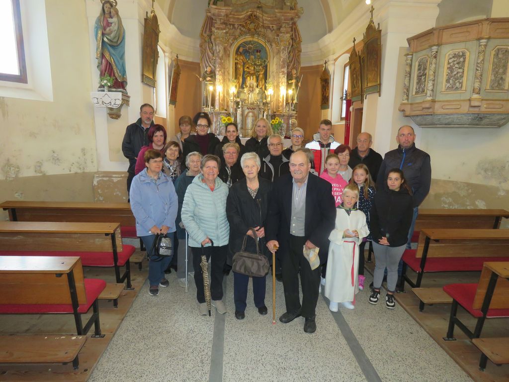 Srečanje smo pričeli ob 10 uri z mašo za pokojne Lesarjeve v cerkvi sv. Ane v Jablanici, župnija Šmartno pri Litiji. Mašo je daroval duhovnik Pavle Juhant. Spomnili smo se pokojnih, osem od enajstih otrok Franca Poglajen in Lidije Dolanc je že pokojnih, poleg tega je pokojnih že kar nekaj sestričen in bratrancev, itd.