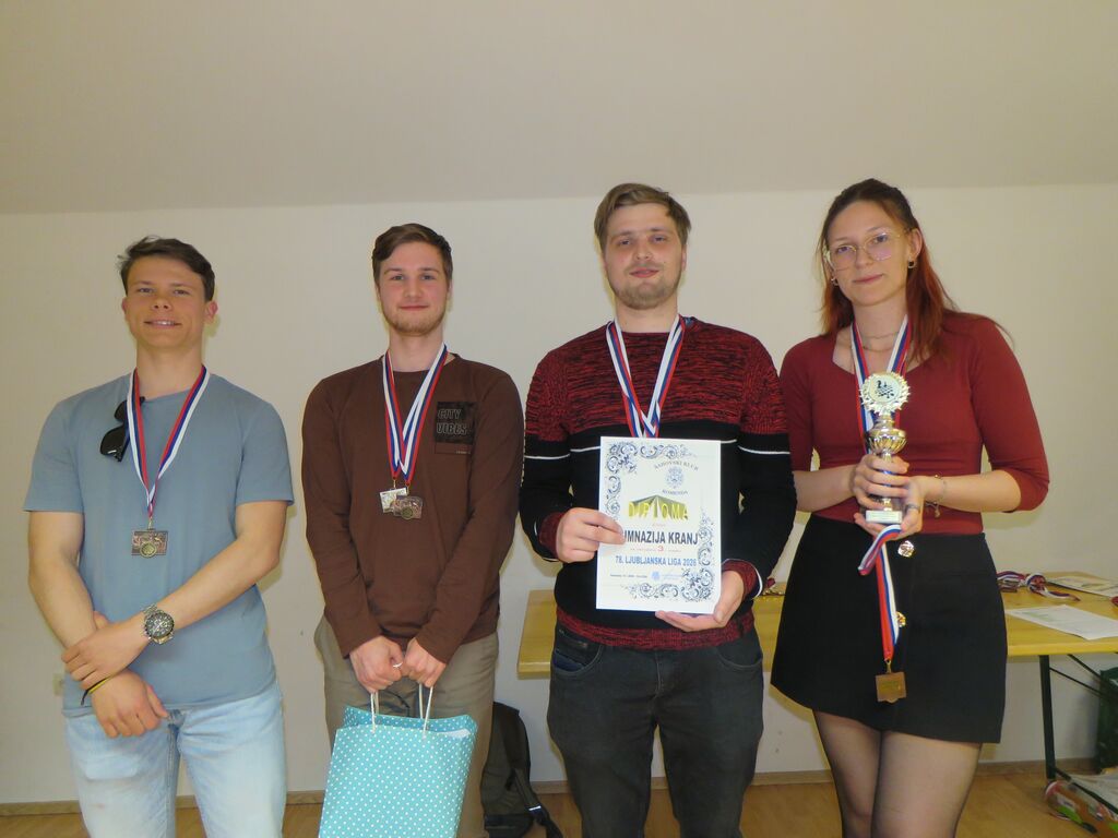 Zmagala je ekipa ŠK MEDVODE 24,5 točk (za ekipo so igrali: Blaž Bratovič, Peter Krupenko, Marko Sajovic, Jurij Rici, Matija Porenta, Janez Ješe, Roman Arčon, Katja Krupenko), sledita ekipi TAJFUN – ŠK LJUBLJANA 24 točk (za ekipo so igrali: Leonard Belyaletdinov, Peter Marinko, David Krstič, Leo Glavač, Bojan Peršl, Vojko Srebrnič, Ema Jakša, Anže Sfiligoj, Dušan Borštar, David Markus, Vid Juvan, Jan Verbič, Jakob Kovačič) in GIMNAZIJA KRANJ 21 točk (za ekipo so igrali: Zala Urh, Maksim Smirnov, Vili Grdič, Anže Gašperlin, Leon Šturm, Aljaž Erman).