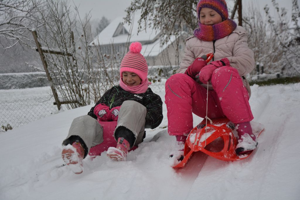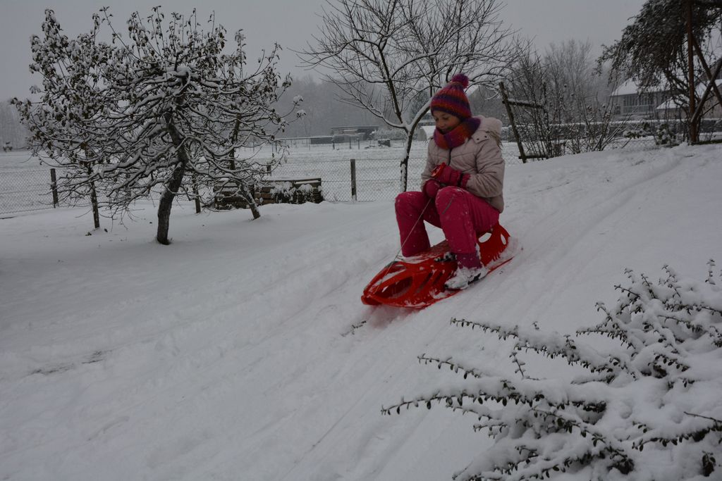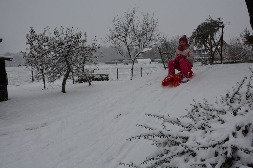 Težko smo ga že vsi pričakovali. Najbolj otroci. Starši manj, saj bo treba z otroki ven. Pa jim ni bilo treba dvakrat reči, sami so šli. Vzeli sani, kar so imeli, da so se lahko spuščali po bregovih navzdol. Tudi če le nekaj metrov. Sneg je tu, naužijmo se ga, zimskih radosti. Da bi šli na Škletov hrib, ga je še premalo. Hvala tistim staršem, ki so mislili na nas, ko so gradili hiše, nam pustili brežino pred njimi. Kako prav nam pride. Mi jim bomo pa pomagali pri kidanju snega. Vsaj potrudili se bomo. Če ga bomo prepeljali s poti le za nekaj »kamiončkov«, bodo veseli. Mama bo našla skrito čokolado, oče fige, ki bi jih sicer prinesel Miklavž; bo pa kaj drugega. Dajmo, še nekaj lopatk, še nekaj »kamiončkov«! Jutri pa naredimo snežaka! Jutri, ko vremenoslovci obetajo že več centimetrov snega. Prvih pet jih je za poskušnjo, jutri bo šlo zares. Naredili bomo pravo progo za sankanje, skakalnico, tudi malo tekaško progo. Slalom bomo vozili, ko bodo na Škletovem hribu postavili smučarsko vlečnico. Na Gori se poskusili v skokih. Nikdar in nikjer še nismo skočili tako daleč, nam niso pripisali še sto metrov. Edino na Gori jih bodo! Zato: ajd na Goro! Najprej pa poskusimo s skoki na domačemu »kuceljnu«. Vsaj dva tri metre daleč. Če padem na nos, ne bo hudo, na Gori pa bo! Prav tako ne bo hudo, če padem na tekaški progi, ki jo bo spet potegnil Zarnikov France. Teči se bom le naučil. Mi bo prav prišlo, če me bo hotel oči, ker sem bil poreden, potegniti "za nos", mami pa za "ta sladke". Kdo še ve zanje?