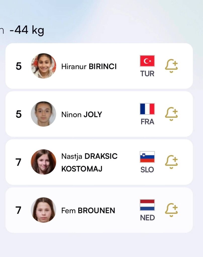 Najvidnejši rezultat je dosegla Nastja Drakšič Koštomaj, ki je s sedmim mestom prvič v karieri osvojila uvrstitev in točke na evropskem pokalu. Tekmovanje je začela odlično z zmago proti tekmovalki iz Ukrajine. V drugem krogu se je pomerila s prvo nosilko turnirja iz Francije, kjer je morala priznati premoč. V repasažu je znova pokazala svojo kakovost in z vzvodom premagala hrvaško predstavnico. V odločilni borbi za uvrstitev pa jo je zaustavila tekmovalka iz Grčije, ki je kasneje osvojila tretje mesto. Kljub temu je Nastja s svojim nastopom dokazala, da se lahko enakovredno kosa z najboljšimi evropskimi tekmovalkami v svoji kategoriji.