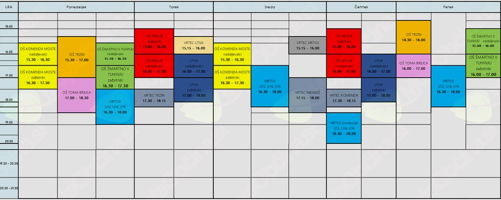 OŠ ŠMARTNO V TUHINJU: ponedeljek: 15.30 - 16.30 (začetniki), 16.30 - 17.30 (nadaljevalci) in petek 15.00 - 16.00 (začetniki), 16.00 - 17.00 (nadaljevalci)