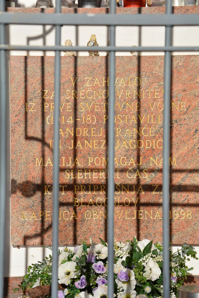 Ustaviva se pri lepo obnovljeni kapelici s podobo brezjanske Marije Pomagaj. Prebereva, da so jo postavili Andrej, France in Janez Jagodic v zahvalo brezjanski Mariji za srečno vrnitev iz prve svetovne vojne. Martin pozvoni, sam pa se spomnim nekdanjega komendskega župnika Zdravka, ki je kot sorodnik leta 1998 poskrbel za obnovo kapelice. Spomnim se tudi, kako mi je eden izmed komendskih faranov pripovedoval, da je bil ob tej kapelici čisto drug, kot v župniji: sproščen, vesel, zgovoren. Njega in prijatelja je celo povabil, naj si postrežeta iz njegovega nahrbtnika. Ob tem se mi prebudi še tretji spomin na pisanje v Družini: kako francoski igralec obiskuje duhovnike po župnijah, nato pa, kar ti doživljajo, zaigra. Tako dobro in pristno, da so še duhovniki sami presenečeni. Mariji Pomagaj izročim v molitvi župnika Zdravka in našega sedanjega župnika p. Cristiana Balinta, vse slovenske duhovnike. Tudi umrlega p. Polikarpa Broliha z Brezij, ki je pred veliko leti, ko je bil še priljubljen spovednik v frančiškanski cerkvi nad Tromostovjem v Ljubljani, doživel nagnusen napad nanj, neverjetno natolcevanje sprevrženega pisca. To ga je zelo potrlo, se je potem umaknil na Brezje.