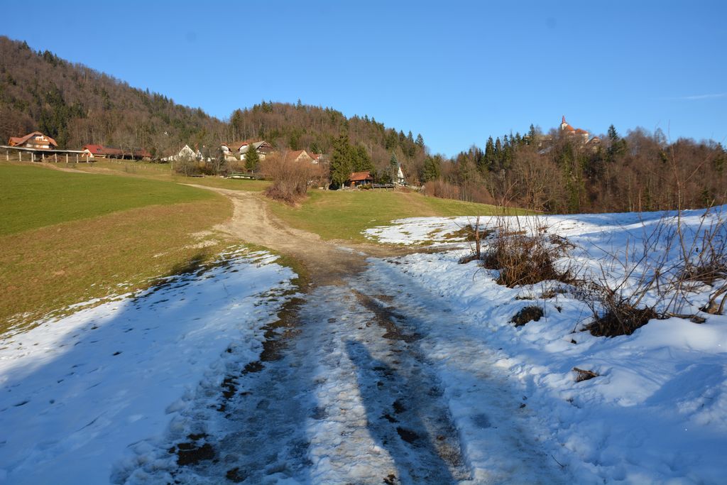 Zato se na hitro odločim: spet od Poženika na Šenturško Goro. Po poti jasličarjev, ki lahko rekel, saj so ob lanskem božiču ob njej postavili več kot sto jaslic. Le ene še vidiva z bratom Martinom, katerega prosim, naj se mi pridruži. Zaradi druščine in tudi varnosti. Mlajša vračajoča se pohodnica naju opozori, naj bova previdna. »Od Flegarije naprej je bolje,« nama zagotovi. Ona si pomaga s palicama, midva pa tako, da se ob poti prijemljeva za veje ali kar debla drevesc, hodiva po skrajnem robu poti levo in desno, največ pa tam, kjer podplati čevljev bolje prijemljejo. Za hojo po sredi – ledu, bi potrebovala dereze.