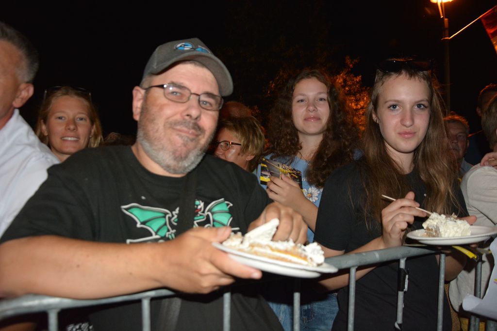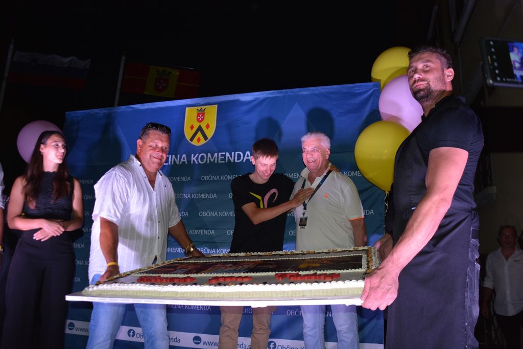 Obiskovalce je čakalo še dvoje. Najprej, vsaj bližnje, Tadejevo pošpricanje z razpenjenim šampanjcem ter prinos in delitev velikanske torte. Najprej je vanjo zarezal in jo pokusil Tadej, nato še stotine obiskovalcev sprejema.