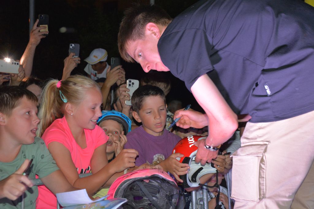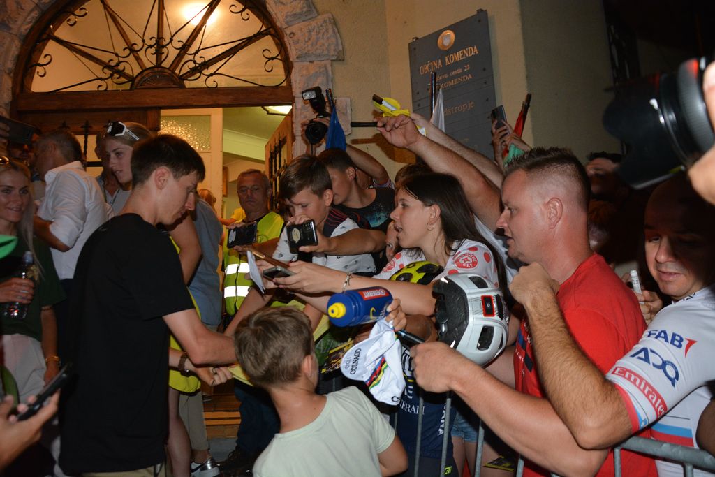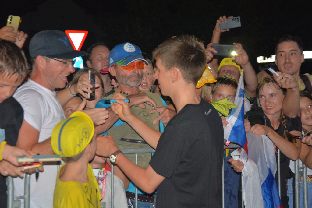 Posebej lepo in ganljivo je bilo, ko se je Tadej začel podpisovati na kartice s svojo fotografijo ter drugo, kar so njegovi občudovalci prinesli s seboj. Mnogi kape z napisom UAE Team Emirates, oblečeni pa so bili tudi v rumene majice Tadejevega zmagovitega moštva. Njegovega podpisa so se zlasti razveselili najmlajši obiskovalci, nekateri še na ramah očetov.