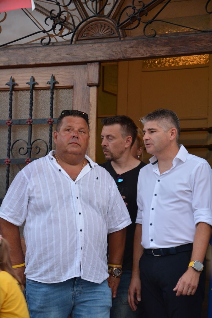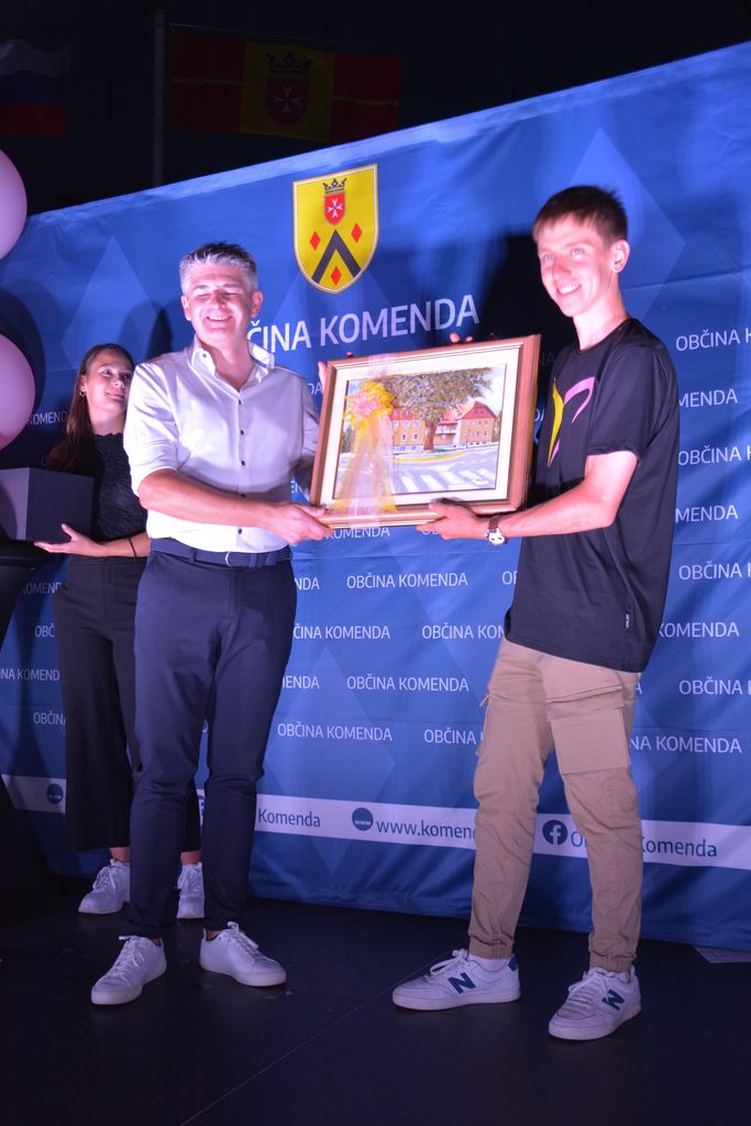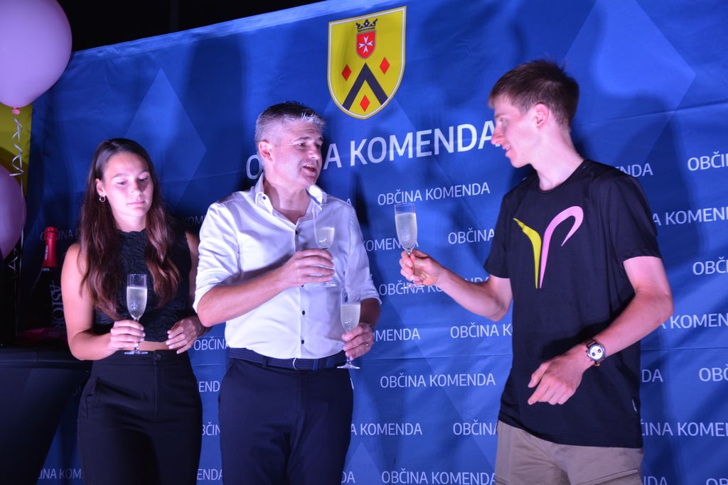 Župan Jurij, pozdravil ga je kot prvi in mu čestital za velika uspeha, ga je obdaril z velikim šopkom rož, sliko občinske stavbe in posebno navijalko ure, da ga življenjski družici Urški ne bo treba buditi.