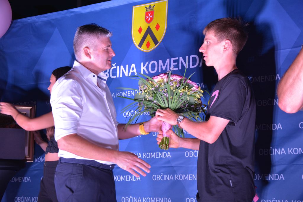 Občini Komenda – županu Juriju Kernu, ki se je s podžupanom Alešem Marinkom, občinsko upravo in ženo Teo zelo potrudil za njegov sprejem – , se je zahvalil z vijoličasto majico zmagovalca na Giru, ki bo odslej krasila občinske prostore.