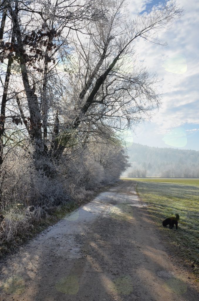 Kmalu se je izkazalo, da danes ne uživam sam v razkošju ivnatega drevja, posipajoče se že v zraku kopneče in v kapljice spreminjajoče se beline na vijugavo pot proti Mlinčkom. Spotoma sem srečeval vaščane, pa tekače, ki jih ne ustavijo niti stopinje krepko pod ničlo. Kimi je tudi kmalu dobil štirinožno prijateljico, se ji začel po pasje dobrikati.