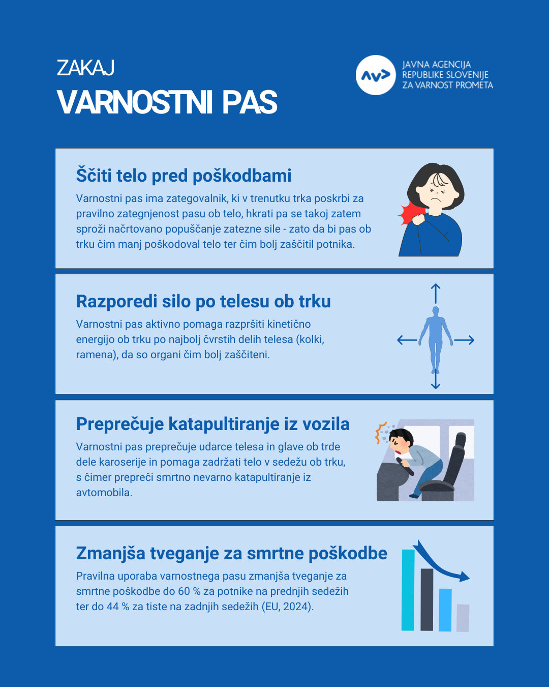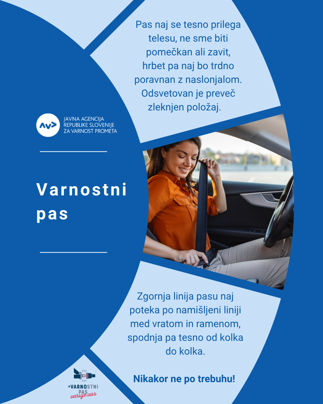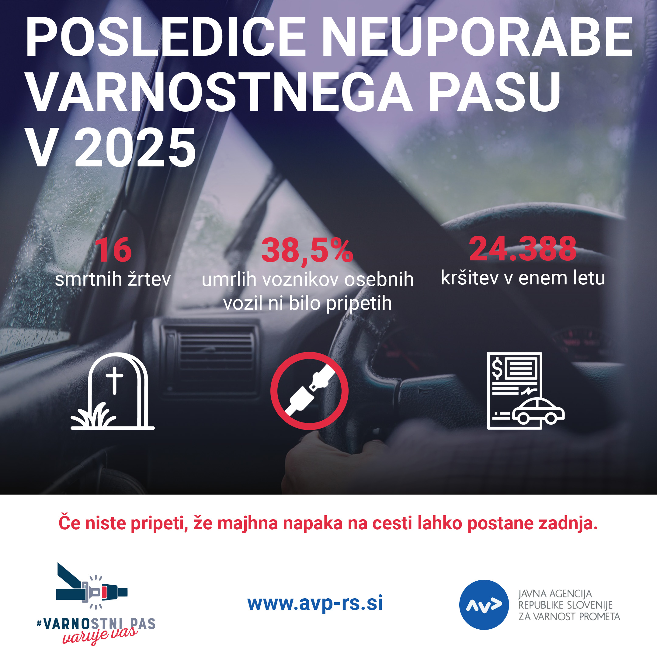 Agencija za varnost prometa (AVP) bo v sodelovanju s Policijo med 9. in 15. marcem 2026 izvajala evropsko usklajeno nacionalno preventivno akcijo Varnostni pas, s katero opozarja na pomen dosledne in pravilne uporabe varnostnega pasu pri vseh udeležencih v vozilu na vsaki, tudi najkrajši poti. Podatki prometne varnosti nas žal znova opozarjajo na zaskrbljujoč trend slabšanja uporabe varnostnega pasu, kar ima neposredne in pogosto usodne posledice. V času akcije bo Policija izvajala poostren nadzor nad uporabo varnostnih pasov in otroških zadrževalnih sistemov v vozilih, pa tudi v avtobusih javnega potniškega prometa, kjer je uporaba varnostnih pasov obvezna, če so vgrajeni.