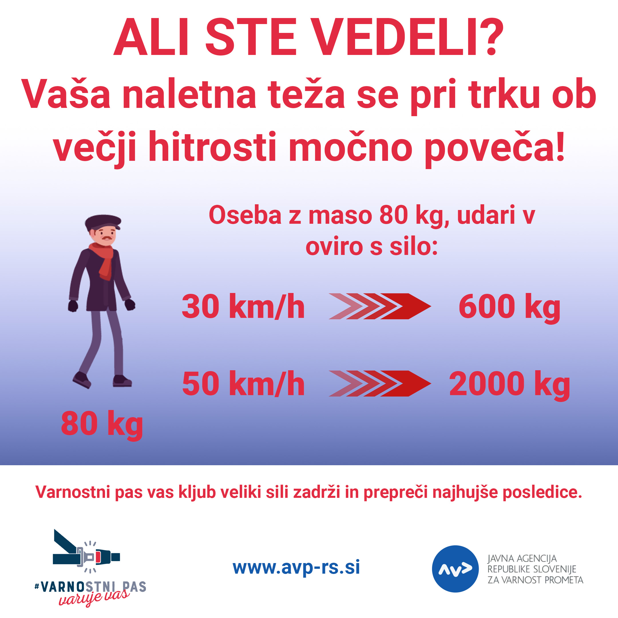 Ali ste vedeli? Z večjo hitrostjo se močno poveča tudi tako imenovana naletna teža. Že pri trku s hitrostjo 30 kilometrov na uro se naletna teža poveča za sedem- do osemkrat, pri 50 kilometrih na uro pa za kar 25-krat. Če to prevedemo v prakso: 80 kilogramov težak potnik, ki na zadnjem sedežu ni pripet, pri trku s 30 kilometri na uro prileti v oviro ali drugega potnika s silo približno 600 kilogramov, pri 50 kilometrih na uro pa z več kot dvema tonama. To je sila, ki ji človeško telo brez varnostnega pasu preprosto ne more kljubovati.