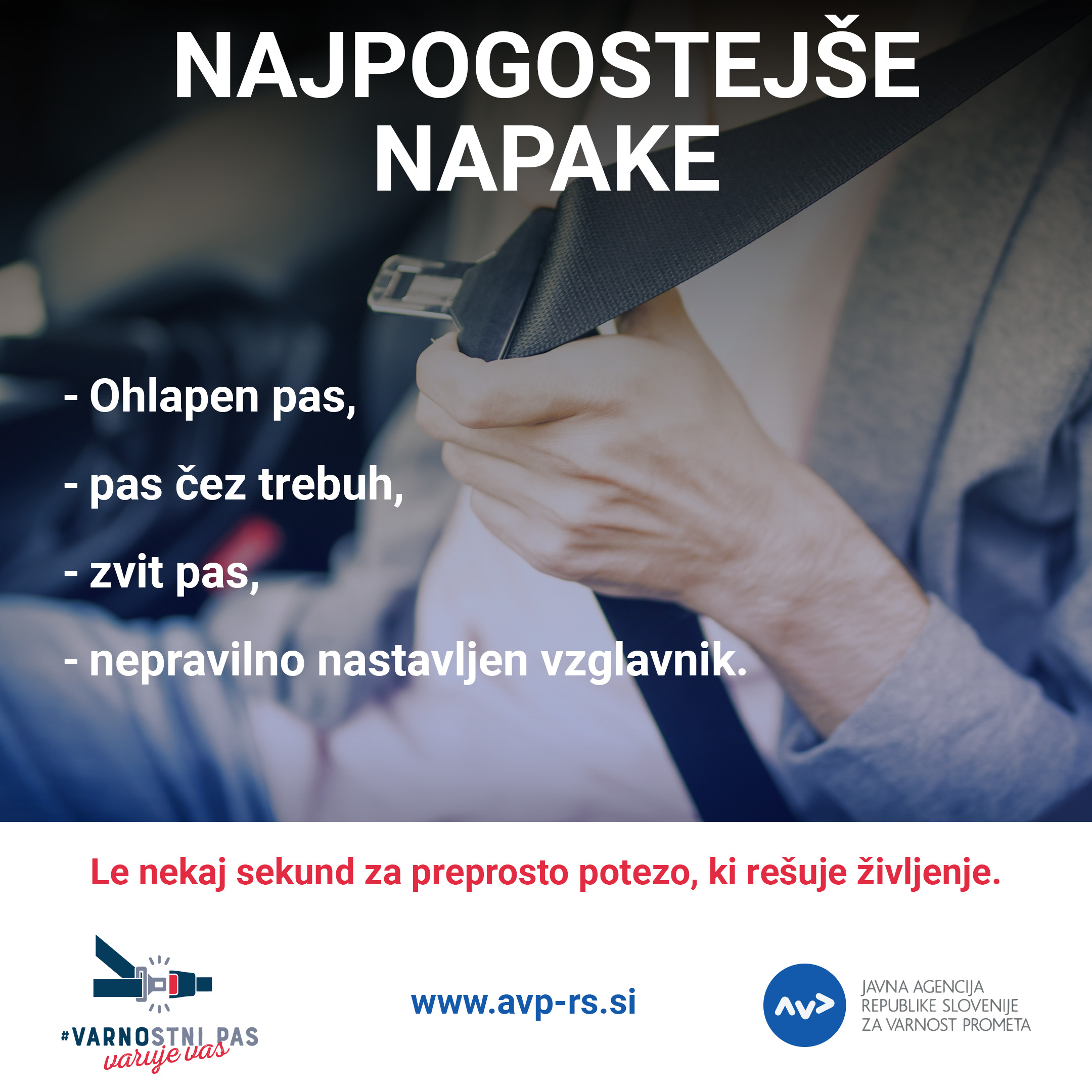 AVP in Policija znova pozivata vse voznike in potnike, naj se vedno in brez izgovorov pripnejo z varnostnim pasom, na vsaki, tudi najkrajši poti. Vozniki naj dosledno poskrbijo za pripetost vseh potnikov, tako odraslih kot otrok. Prometne nesreče namreč vedno znova potrjujejo, da bi bile posledice pogosto bistveno blažje – ali pa jih sploh ne bi bilo – če bi bil varnostni pas uporabljen pravilno in dosledno.