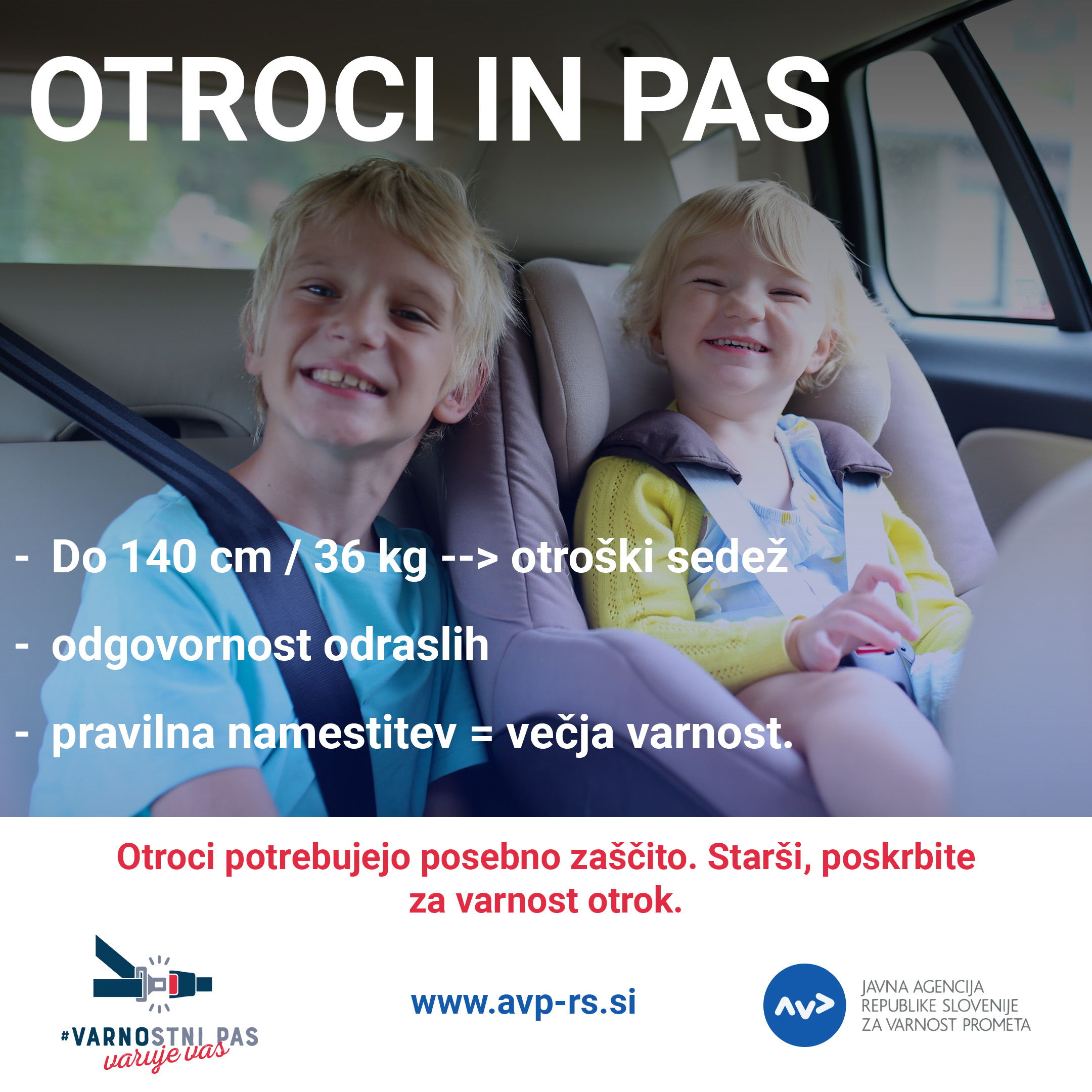 Otroci so kot potniki med najbolj ranljivimi udeleženci v prometu. Že ob manjših hitrostih in navidezno lažjih trkih lahko utrpijo hude poškodbe, zato morajo biti vedno pravilno pripeti. Otroci, manjši od 140 centimetrov ali lažji od 36 kilogramov, morajo biti med vožnjo pripeti v ustreznem otroškem varnostnem sedežu, prilagojenem njihovi višini ali teži, ki mora biti pravilno nameščen in zategnjen v skladu z navodili proizvajalca. Odgovornost za varno pripenjanje otrok je vedno na strani odraslih.