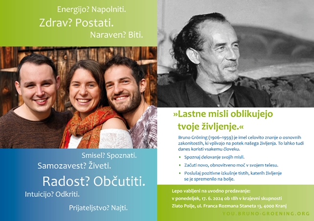 Lepo vabljeni na brezplačno informativno predavanje na temo: "LASTNE MISLI OBLIKUJEJO TVOJE ŽIVLJENJE - BRUNO GROENING."