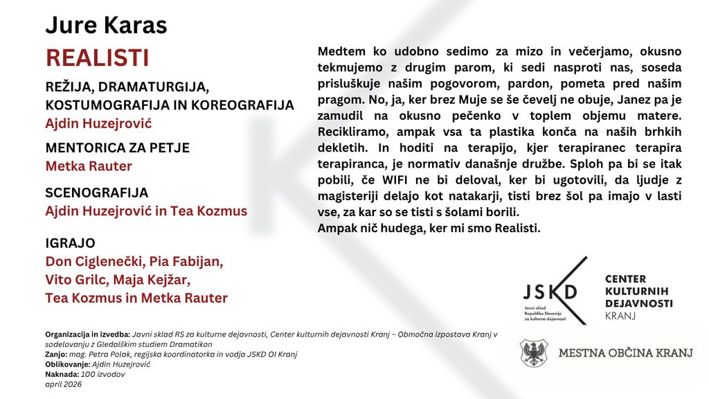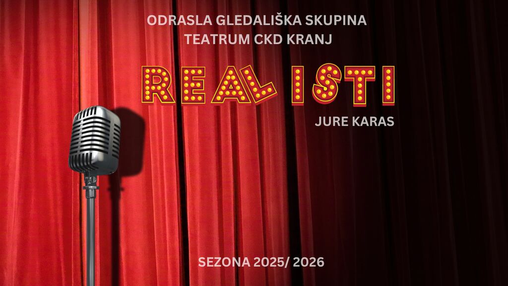 Tretja gledališka premiera sezone 2025/2026 Centra kulturnih dejavnosti Kranj (v produkciji JSKD OI Kranj), ki je nastala v sodelovanju z našo odraslo Gledališko skupino Teatrum Centra kulturnih dejavnosti Kranj in Gledališkega studia Dramatikon Kranj, bo predstava Realisti.