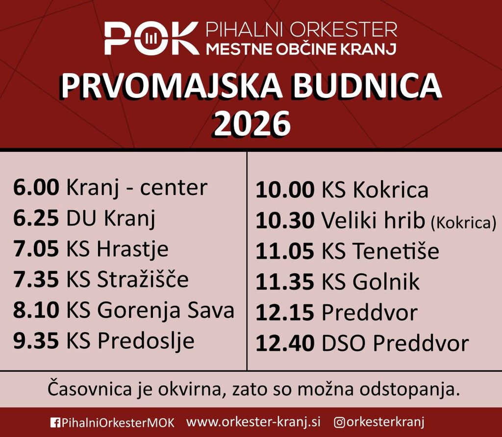 Pihalni orkester Mestne občine Kranj bo tudi letos obeležil praznik dela s tradicionalno prvomajsko budnico. V petek, 1. maja 2026, bodo že v zgodnjih jutranjih urah s pesmijo in igranjem prinesli praznično vzdušje po različnih krajevnih skupnosti.
