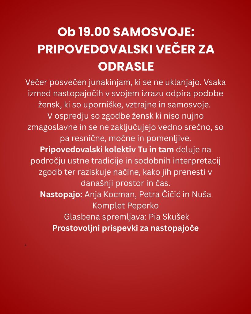 Pripovedovalke bodo vsaka v svojem slogu pripovedovale o junakinjah, nepodredljivih, upornih, vztrajnih, tistih, ki ne čakajo, da se jim usoda zgodi, ampak jo pogumno in včasih predrzno vzamejo v svoje roke.