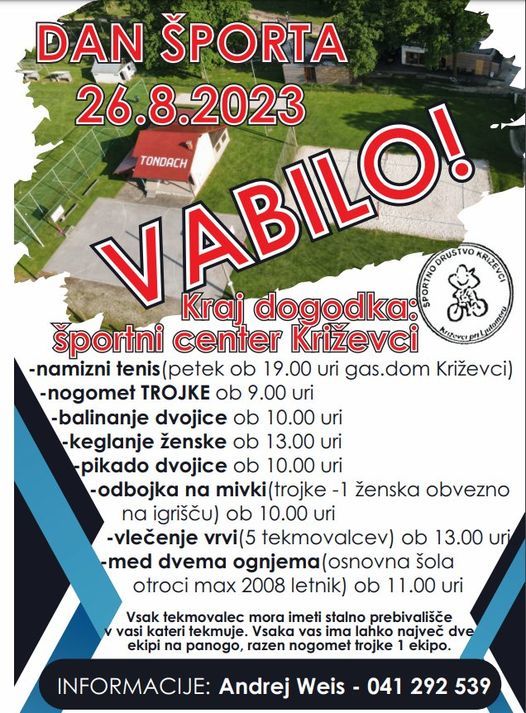 V soboto 26.avgusta bo v športnem centru Križevci potekal Dan Športa. Na voljo je veliko različnih disciplin: namizni tenis, nogomet trojke, balinanje dvojice, keglanje ženske, pikado dvojice, odbojka na mivki trojke (vsaj 1 ženska obvezno), vlečenje vrvi in med dvema ognjema ((pogoj letniki 2009 in mlajši).