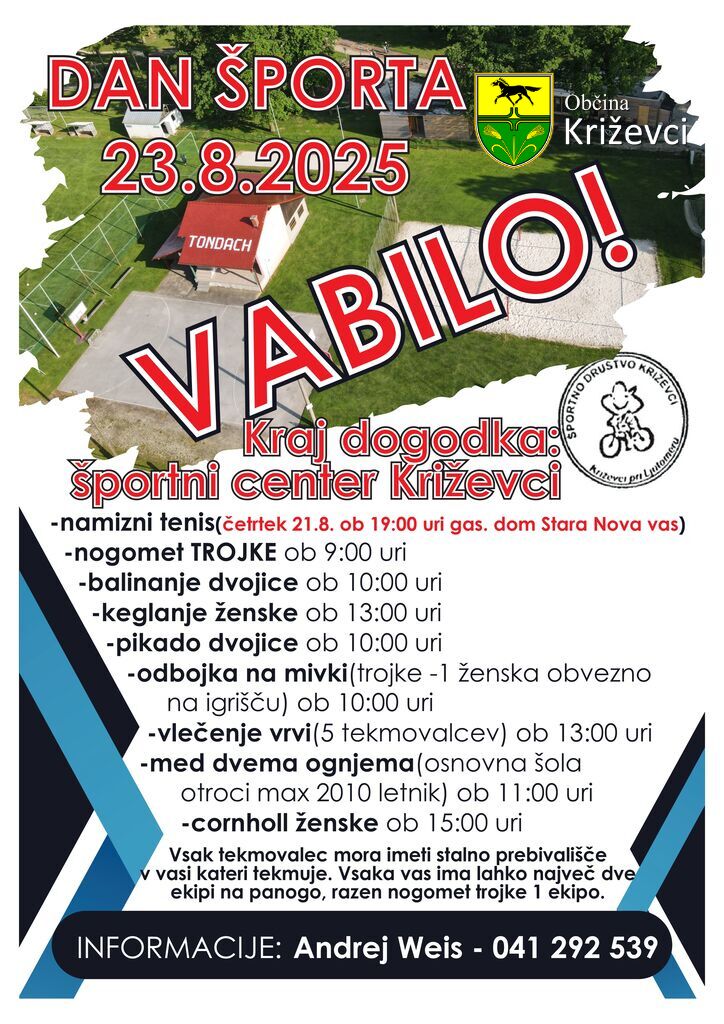 Kontaktni podatki organizatorja: ŠPORTNO DRUŠTVO KRIŽEVCI Andrej Weis 041 292 539.