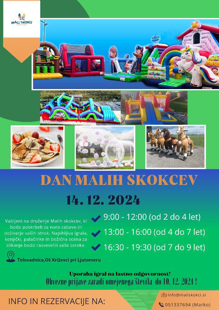 Vabljeni na druženje Malih skokcev, ki bodo poskrbeli za noro zabavo in doživetje vaših otrok. Napihljiva igrala, konjički, palačinke in čarobni mehurček z božično sceno bodo razveselili vaše otroke.