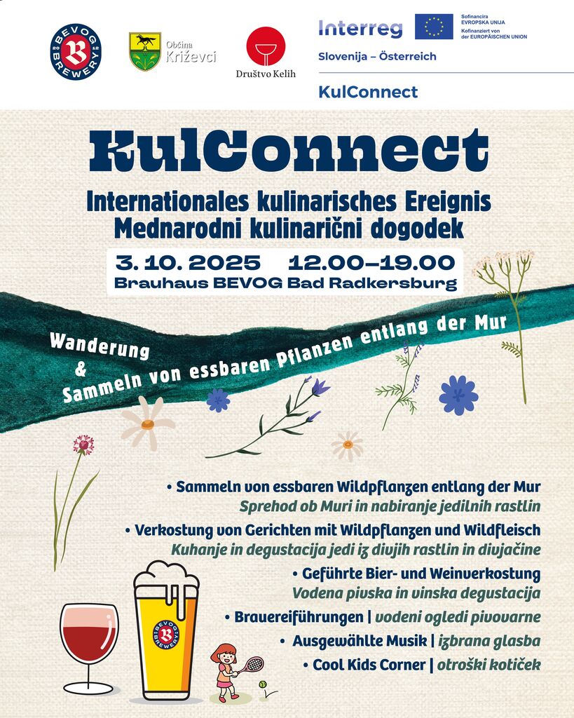 Kulconnect je mednarodni dogodek v okviru projekta Interreg, katerega cilj je povezovanje slovenskih in avstrijskih skupnosti skozi kulinariko, vino, pivo, kulturno dediščino in družabne dogodke. Prvi dogodek bo potekal 20. septembra 2025 v Občini Križevci, Slovenija, drugi pa 3. oktobra pri Brauhaus Bevog v Bad Radkersburgu, Avstrija.
