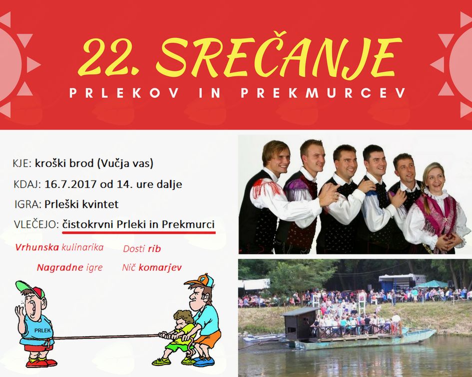 V nedeljo, 16. juilja 2017, se bo pri kroškem brodu v Vučji vasi zgodilo že 22. srečanje Prlekov in Prekmurcev ob reki Muri. Rdeča nit prireditve je vlečenje vrvi čez reko Muro.