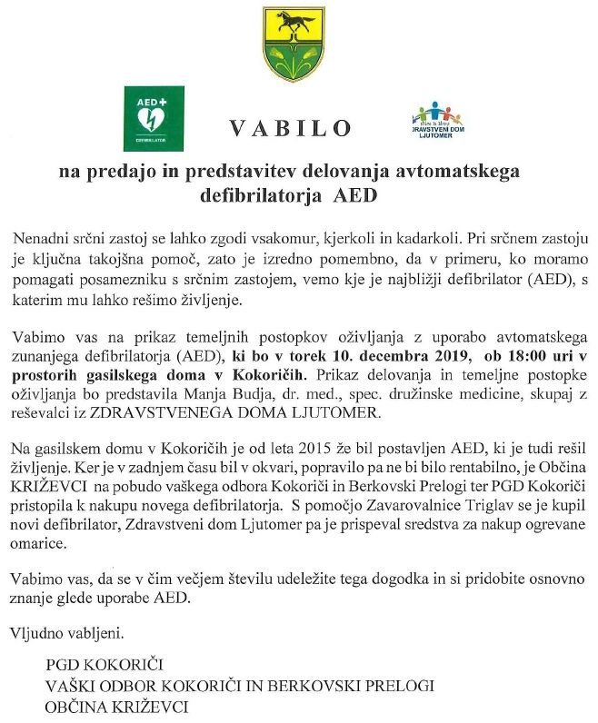 Predaja in predstavitev delovanja AED Kokoriči