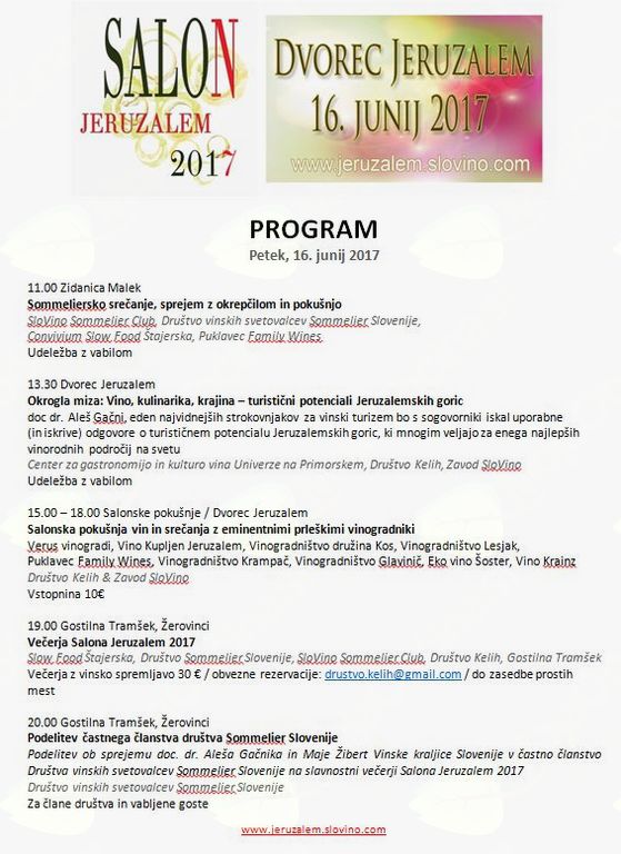 Salon Jeruzalem 2017 se bo zgodil v petek, 16. junija 2017, v Dvorcu Jeruzalem na Jeruzalemu. Kljub novi časovni umestitvi tradicionalne prireditve se obeta resnično bogat program, ki bo letos povezal še več inštitucij z območja cele Slovenije.