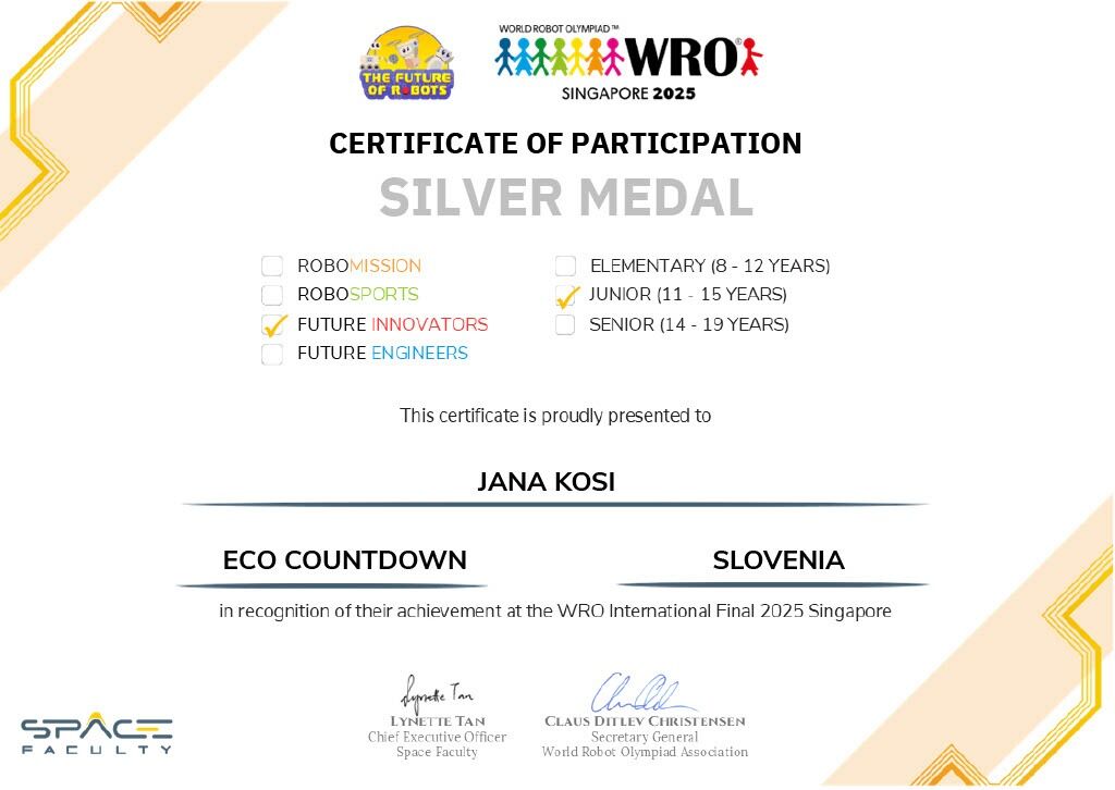 Uvrstitev v Silver group ni le tekmovalni uspeh, temveč tudi dokaz, da lahko mladi z znanjem, radovednostjo in vztrajnostjo konkurirajo najboljšim na svetu. Ekipa Eco Countdown je s svojo inovativnostjo in razumevanjem trajnostnih izzivov navdušila mednarodno strokovno žirijo ter pokazala, da Slovenija premore izjemen mlad tehnološki potencial.