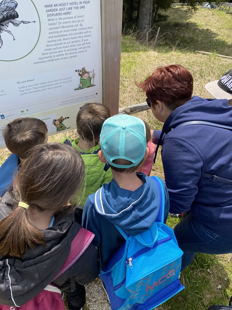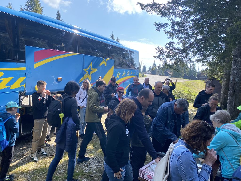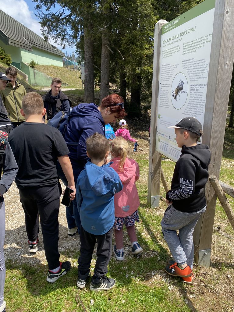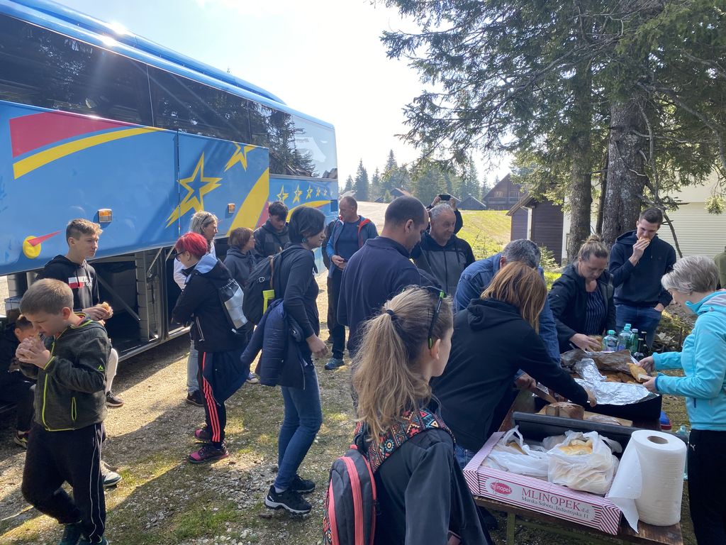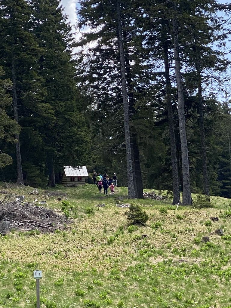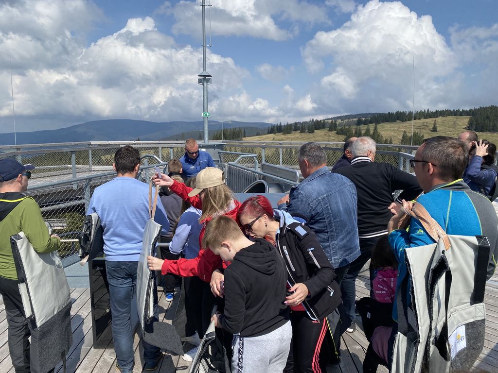 Druga postaja, ki je bila oddaljena le dobre pol ure, je bila Rogla. Nekaj (beri velikoooo) levih in desnih ovinkov in krave, ki so v potoku bredle na boljšo stran pašnikov, prikupne koče in sonce, ki je kar vabilo med krošnje in mi, ki smo se kljub vetru, podali na pot Med krošnje. Naenkrat vse potihne in ostaneš le ti in drevesa. Če pogledaš pod sebe, vidiš mogočne krošnje in če poslušaš, slišiš petje ptic. Ob počasnem dviganju se pot vije navzgor na stolp in ob poti spoznavaš živali in rastline, ki jih lahko najdeš in vidiš. Učna pot je bila zanimiva tudi za velike udeležence in ne samo za otroke. Ko prideš do konca pa, vauuu vdihni in se razglej. Pred tabo se razprostre celotna dolina in griči. Če v osnovni šoli nisi sedel na ušesih, se poskušaš kar spomniti, kaj vse vidiš. Komur pa to ni uspelo, pa je bil vesel naše vodičke, ki nam je kar z veseljem vse povedala. Naša hoja na stolp je bila poplačana – v kolikor si seveda s sabo spodaj vzel vrečo za spust, se nisi pokakal v hlače in se usedel na tobogan, po katerem si se popeljal navzdol. Brez skrbi, vsi smo preživeli in se nasmejali in skoraj zagotovo bomo, ko nas bo pot še enkrat popeljala na Roglo, to ponovili.