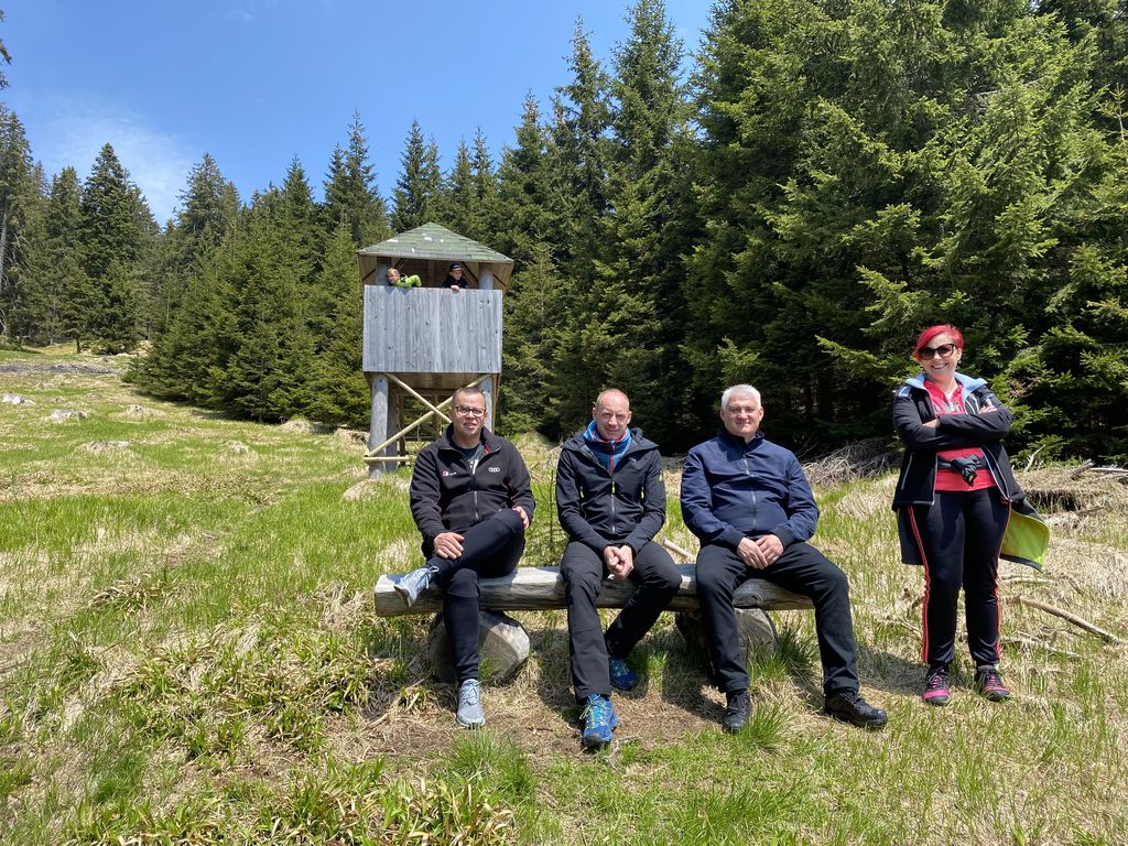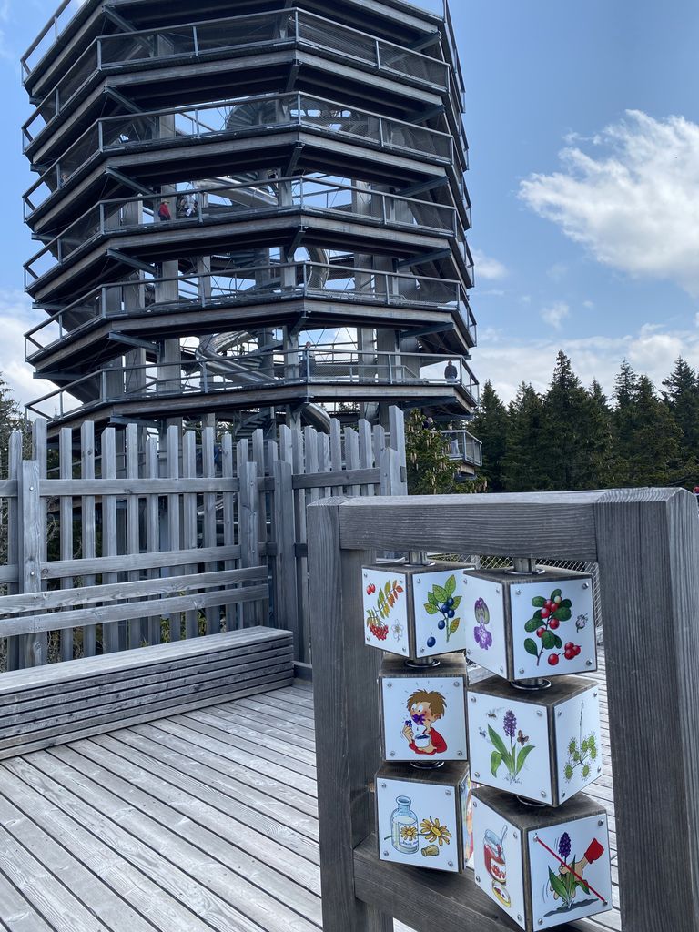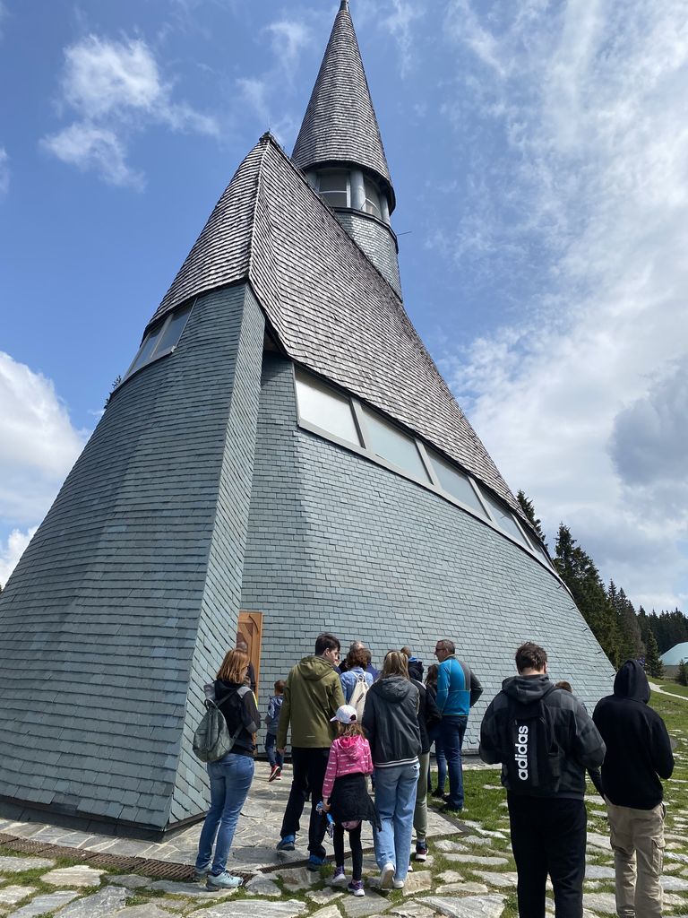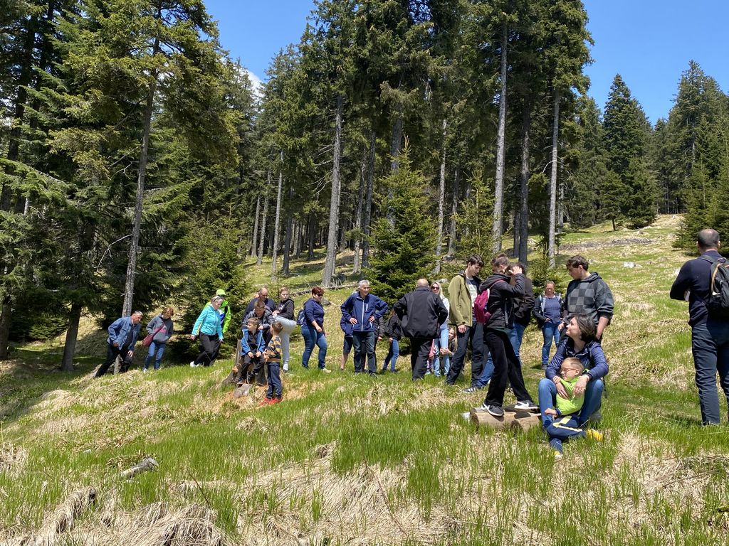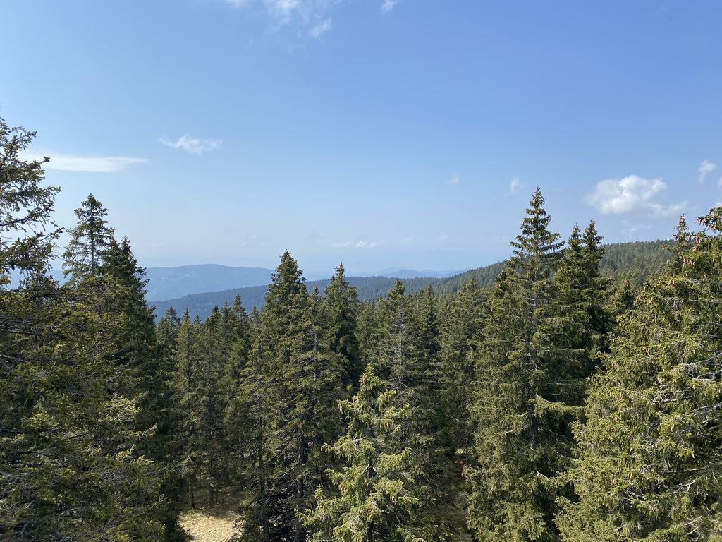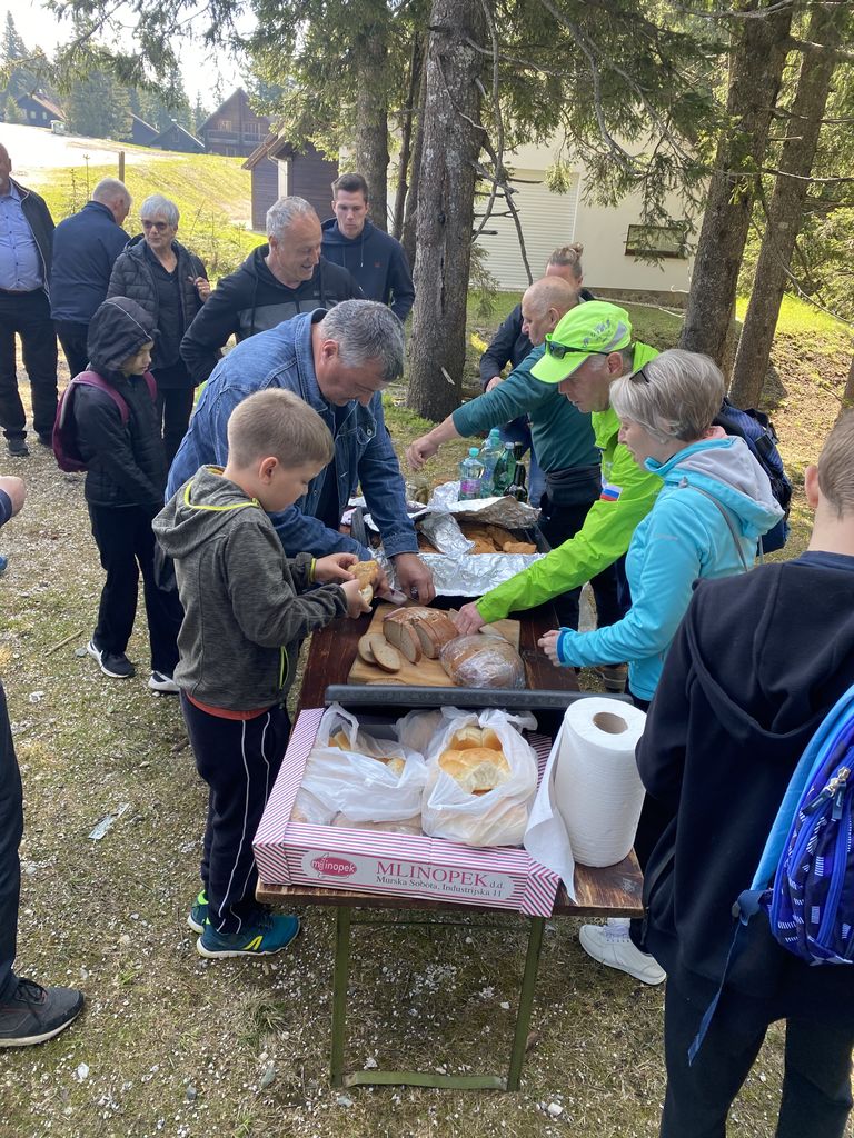 Druga postaja, ki je bila oddaljena le dobre pol ure, je bila Rogla. Nekaj (beri velikoooo) levih in desnih ovinkov in krave, ki so v potoku bredle na boljšo stran pašnikov, prikupne koče in sonce, ki je kar vabilo med krošnje in mi, ki smo se kljub vetru, podali na pot Med krošnje. Naenkrat vse potihne in ostaneš le ti in drevesa. Če pogledaš pod sebe, vidiš mogočne krošnje in če poslušaš, slišiš petje ptic. Ob počasnem dviganju se pot vije navzgor na stolp in ob poti spoznavaš živali in rastline, ki jih lahko najdeš in vidiš. Učna pot je bila zanimiva tudi za velike udeležence in ne samo za otroke. Ko prideš do konca pa, vauuu vdihni in se razglej. Pred tabo se razprostre celotna dolina in griči. Če v osnovni šoli nisi sedel na ušesih, se poskušaš kar spomniti, kaj vse vidiš. Komur pa to ni uspelo, pa je bil vesel naše vodičke, ki nam je kar z veseljem vse povedala. Naša hoja na stolp je bila poplačana – v kolikor si seveda s sabo spodaj vzel vrečo za spust, se nisi pokakal v hlače in se usedel na tobogan, po katerem si se popeljal navzdol. Brez skrbi, vsi smo preživeli in se nasmejali in skoraj zagotovo bomo, ko nas bo pot še enkrat popeljala na Roglo, to ponovili.