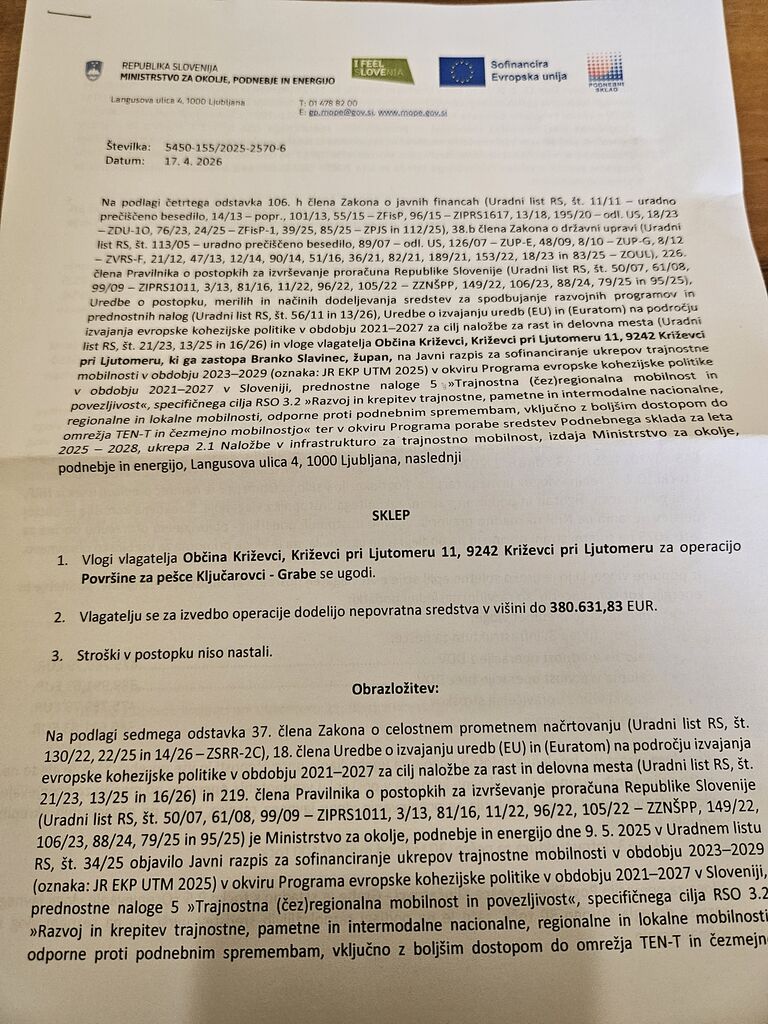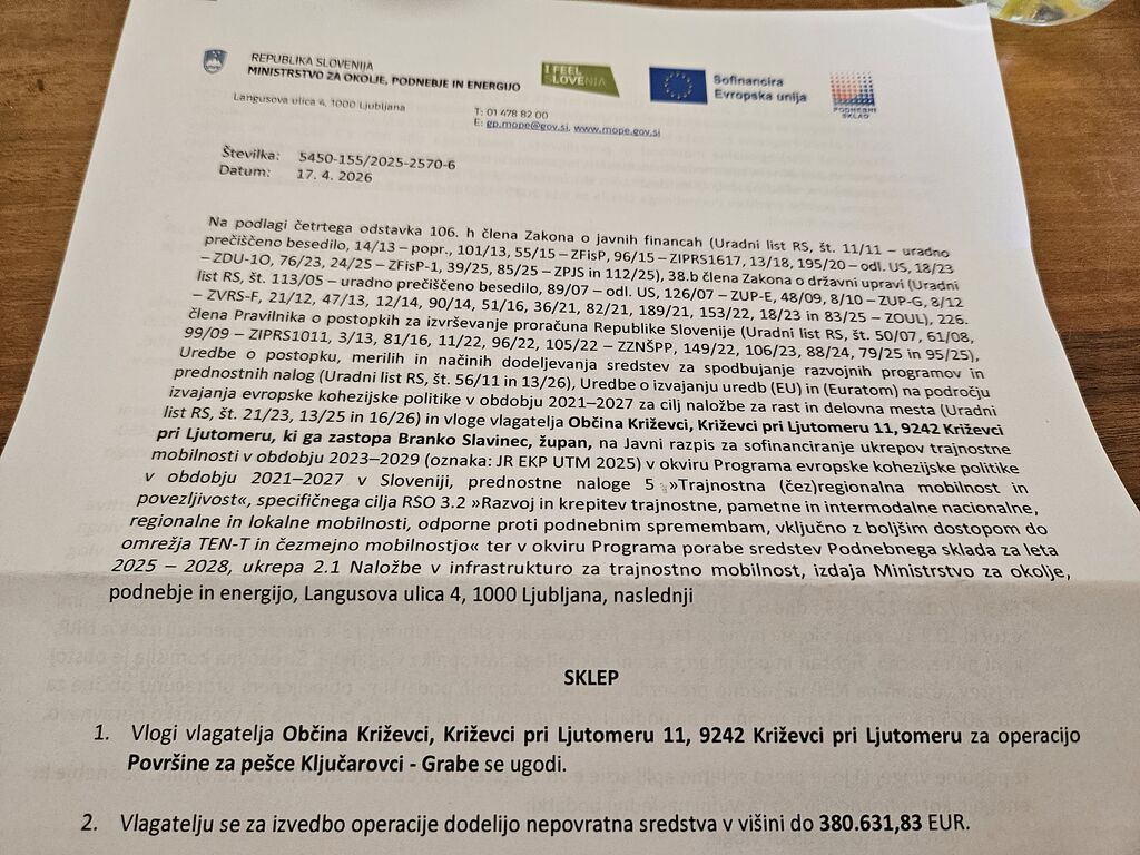 Občina Križevci je dne 21. aprila 2026 je prejela sklep o sofinanciranju enega najpomembnejših infrastrukturnih projektov zadnjih let – ureditve peš površin na relaciji Ključarovci – Grabe. Projekt, ki ga podpira Ministrstvo za okolje, podnebje in energijo, je sofinanciran v znesku 380.631,83 evra in predstavlja pomemben mejnik na poti k sodobni, varni in trajnostno naravnani občini.